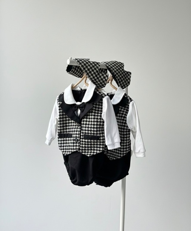 【即納】2点セット 千鳥格子柄の王子スーツ 王冠付き 男の子 おめかし ロンパース セレモニースーツ 結婚式 お呼ばれ ベビースーツ 1歳誕生