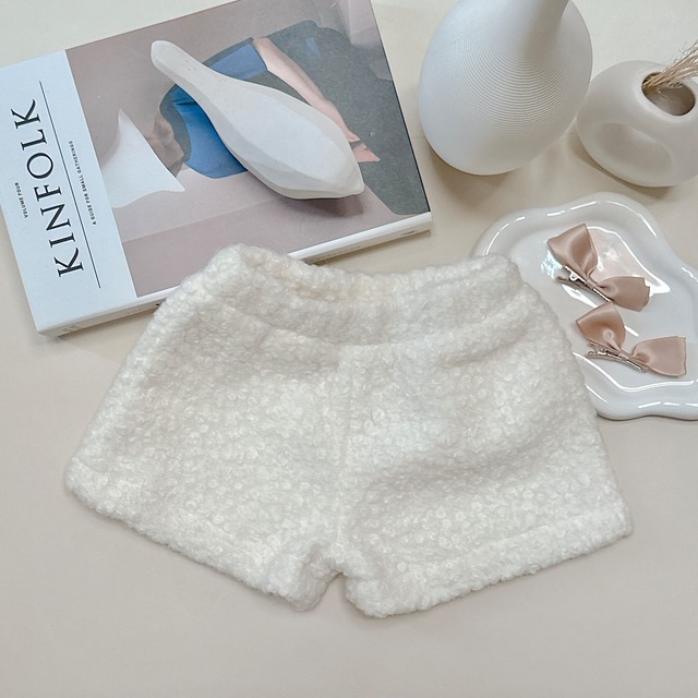 ベビーキッズのボアショートパンツ。 もこもこ感がとってもキュート♪ ふんわりあったか。インナーにタイツやレギンスと合わせて。 【color】white 【裏地】あり 【Size】 1: 80 (8-10kg) 2: 90 (10-12kg) 3: 100(12-14kg)