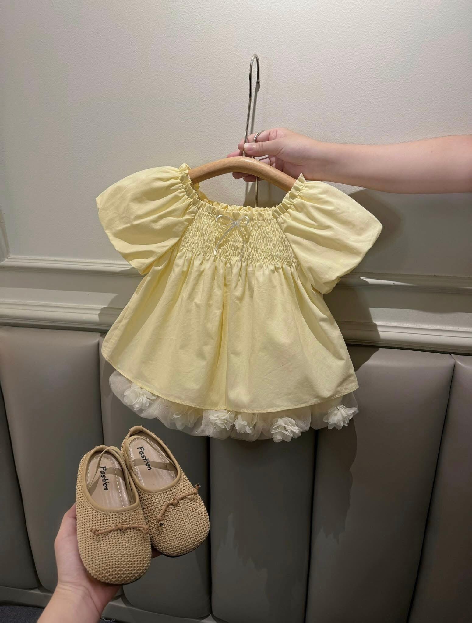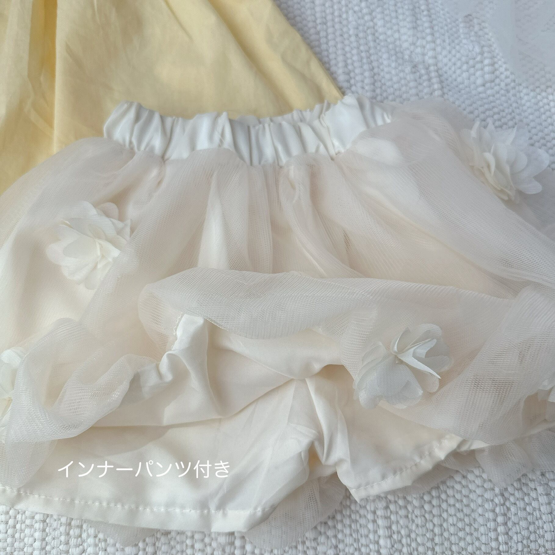 シャーリングデザインのブラウスは、リボンがアクセントになっており、可愛らしさと上品さを両立しています。さらに、チュールスカートには手作業で丁寧に付けられたお花がポイントの、ふんわりチュールスカートです。インナーパンツも付いているため、安心して動き回れます。