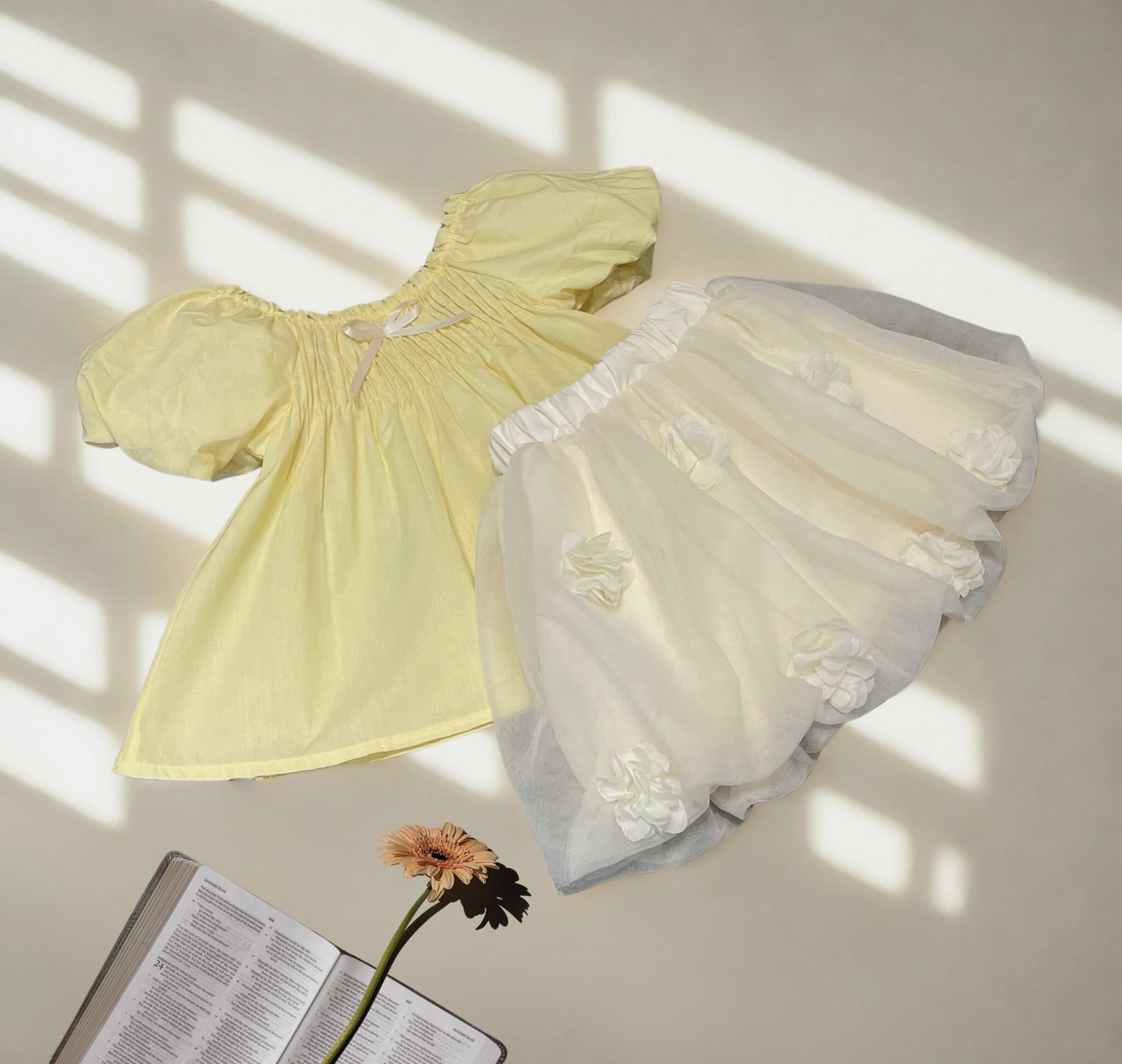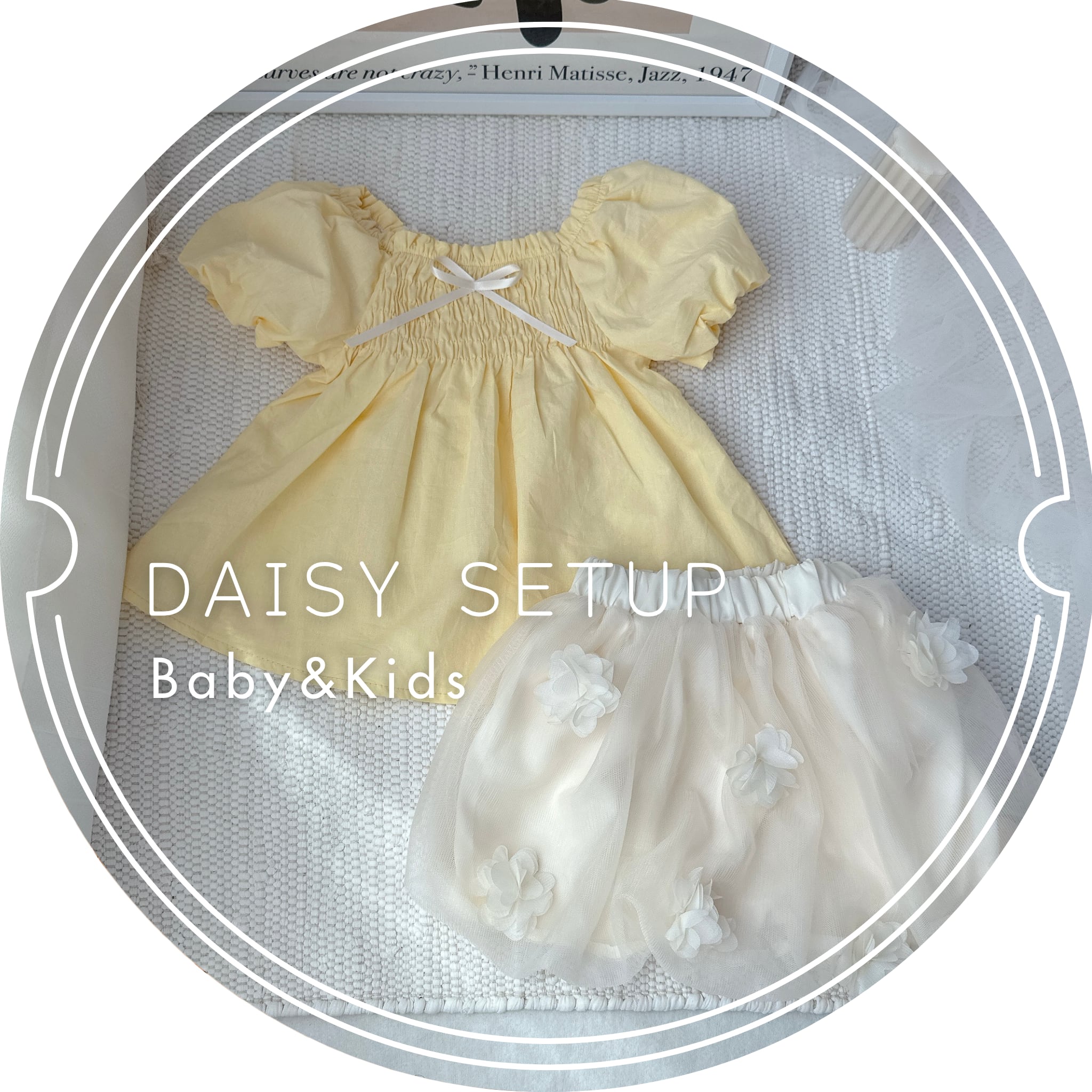 【即納 2点セット】daisy setup シャーリングリボンブラウス& お花モチーフチュールスカート