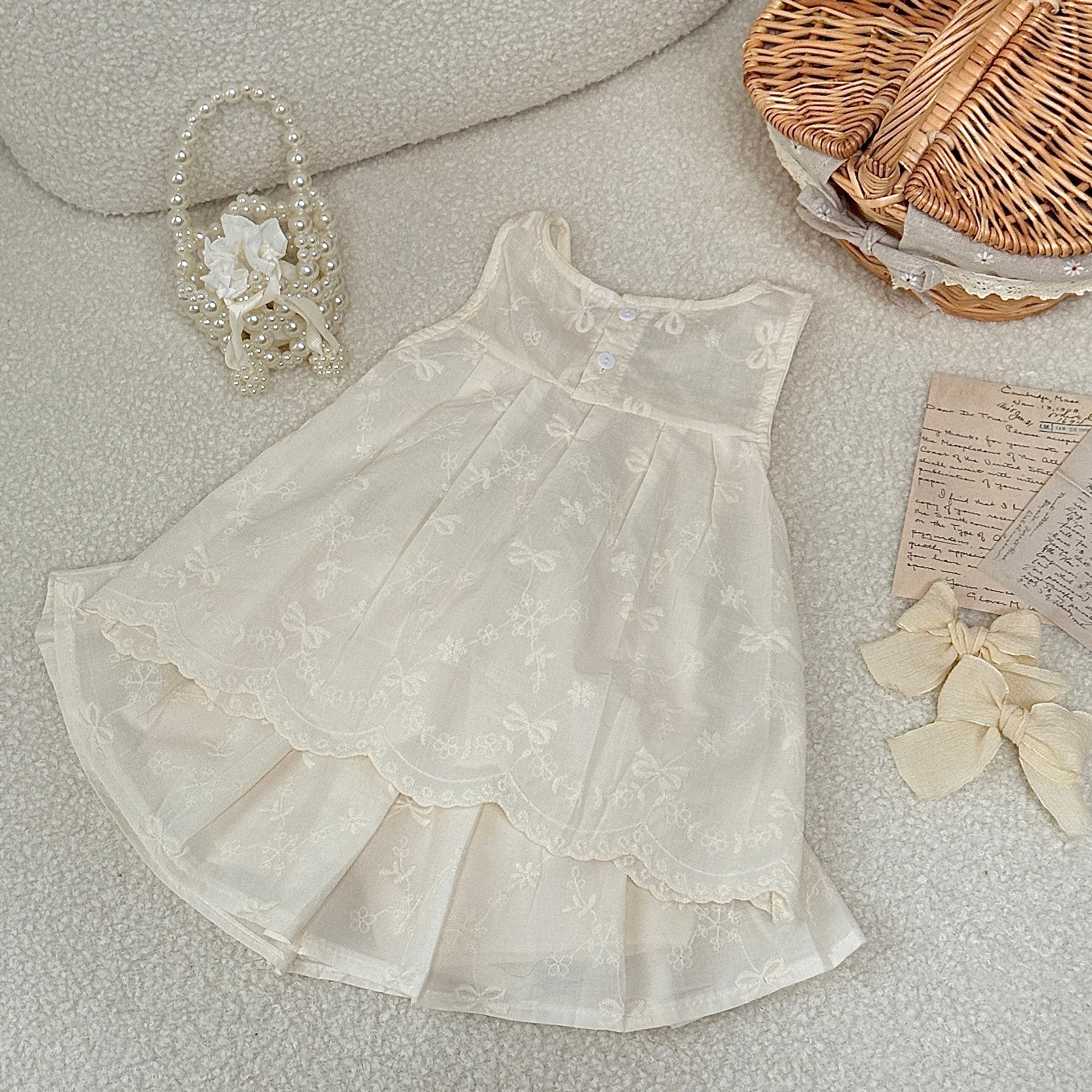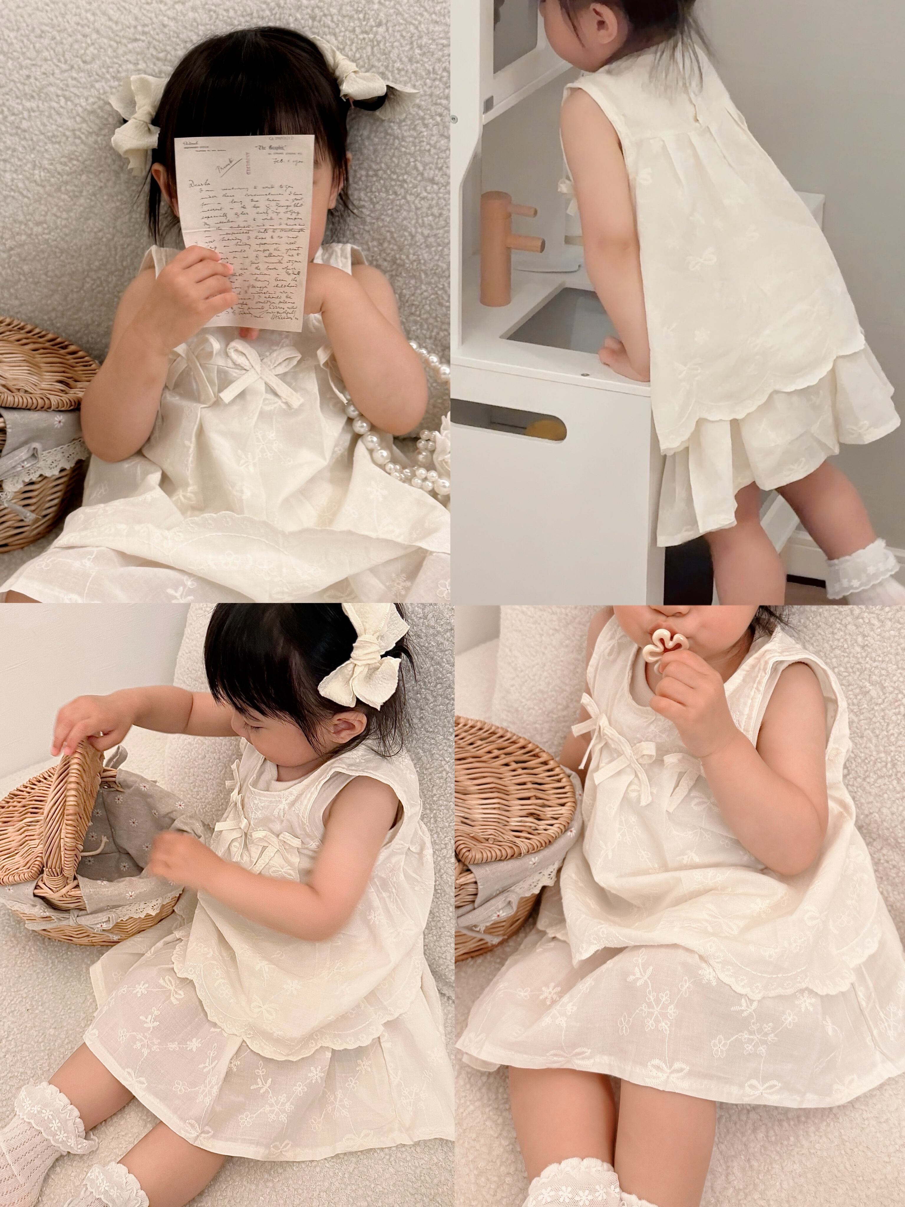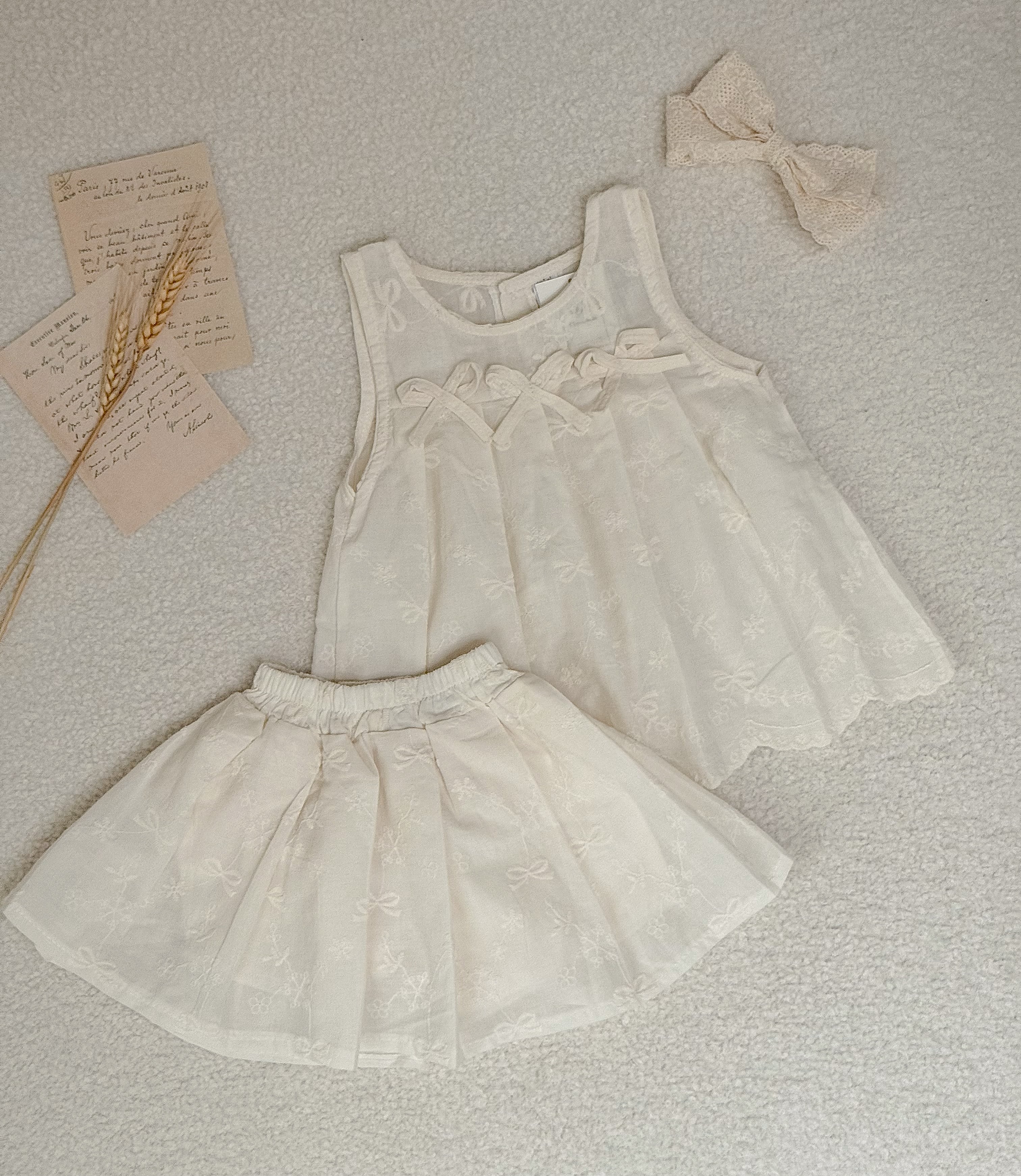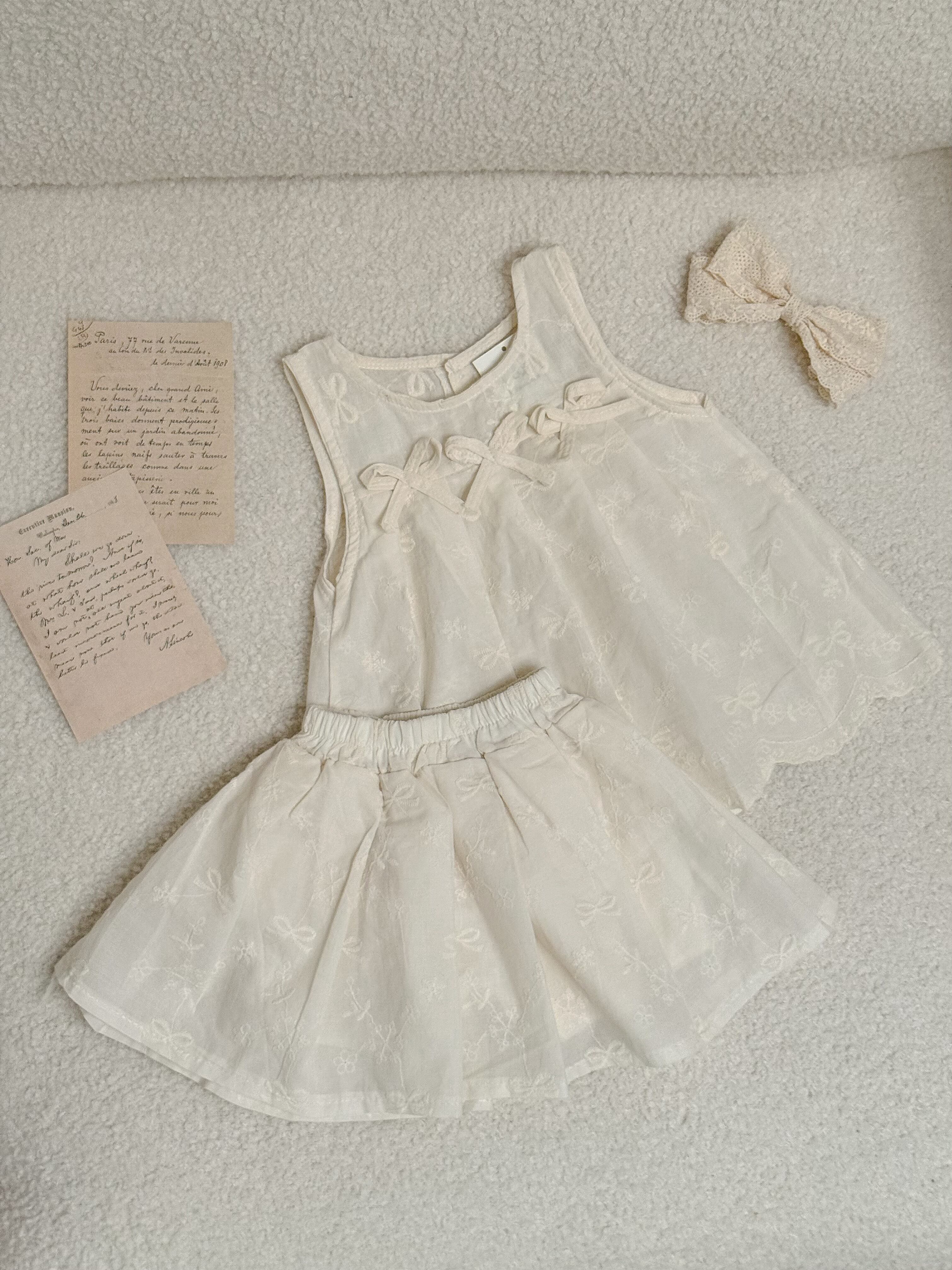 【即納 2点セット】 刺繍生地のリボントップス&スカート セットアップ ブルマ カジュアル ベビー服 子供服80cm/90cm/100cm/110cm