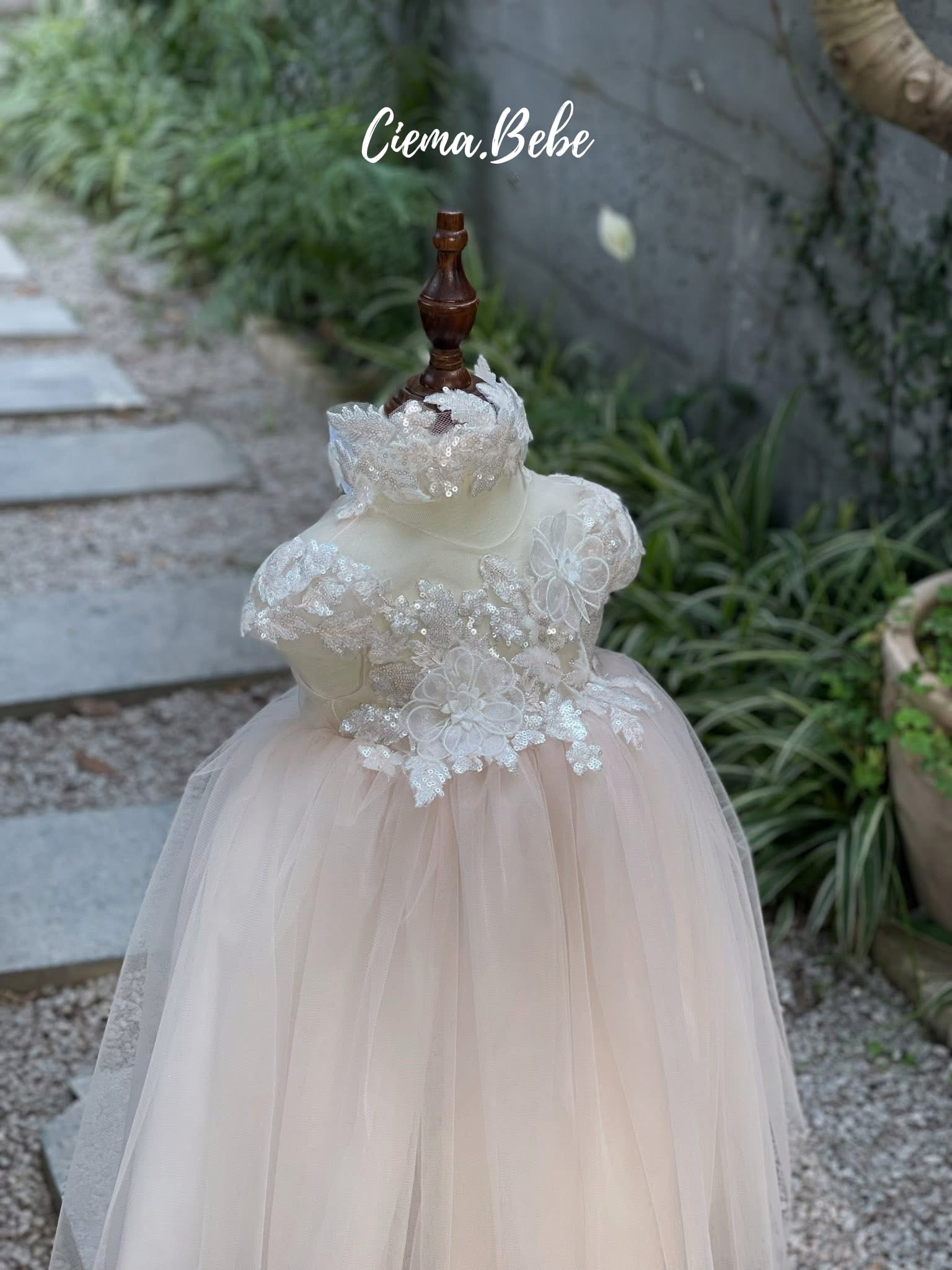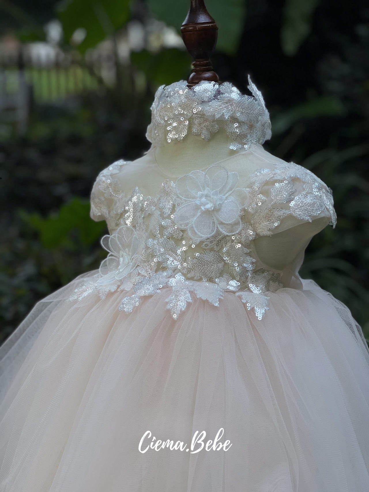 トップス部分には、精巧なレースワークと煌めくスパンコールがあしらわれ、上品な華やかさを添えています。