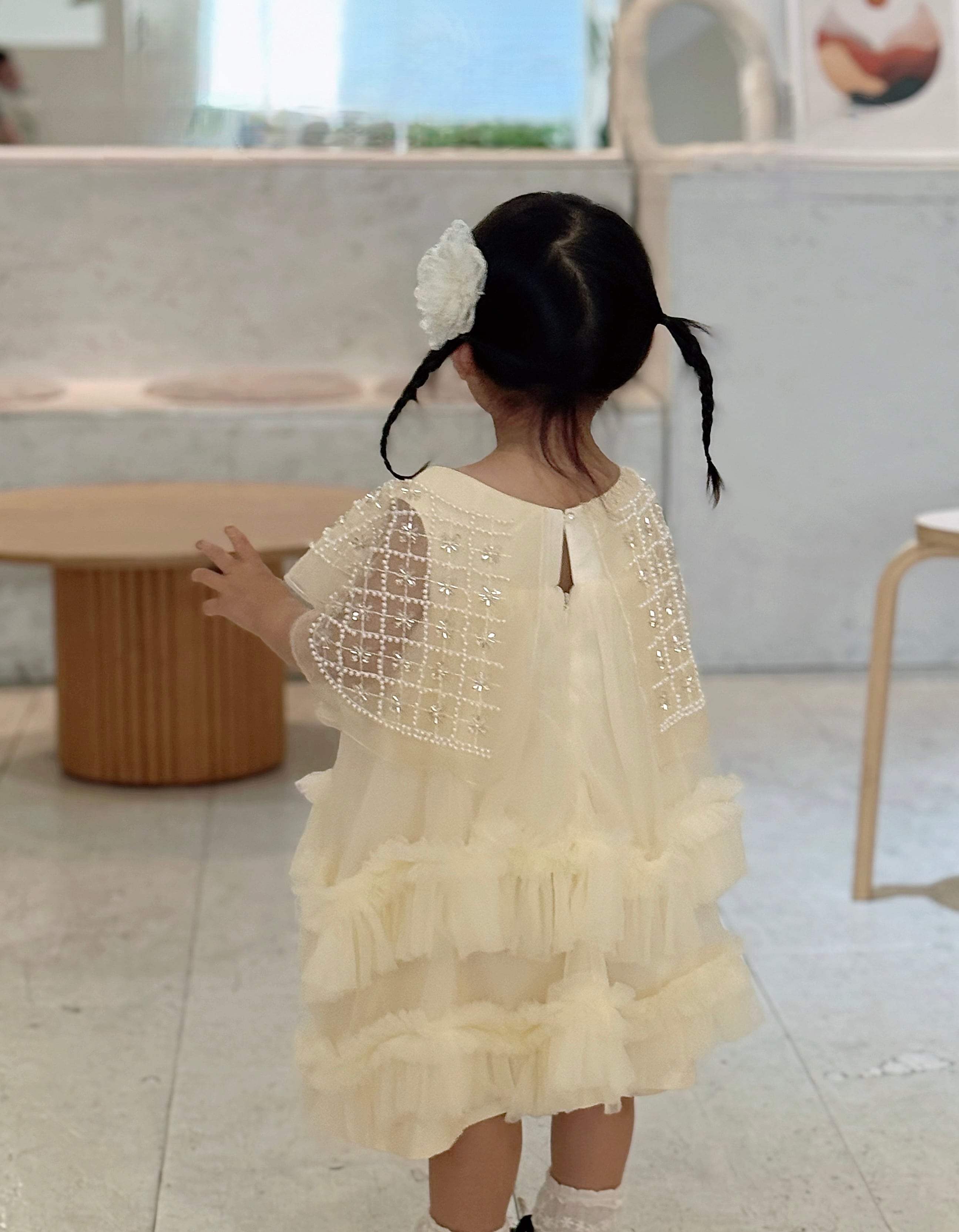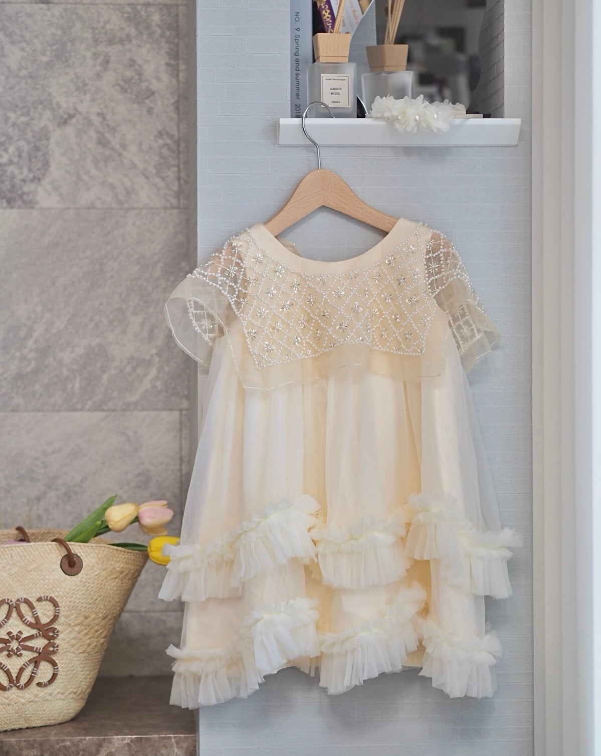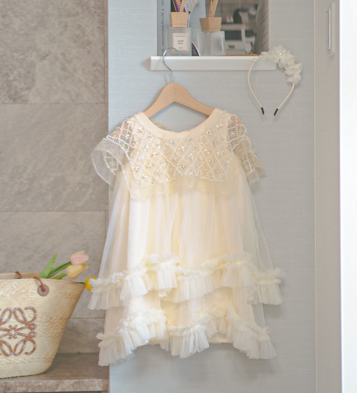 上品なパール&スパンコール付きのスクエアネックと綺麗なチュールが魅力的です。パーティーや発表会など、特別な日のおしゃれにもピッタリです。