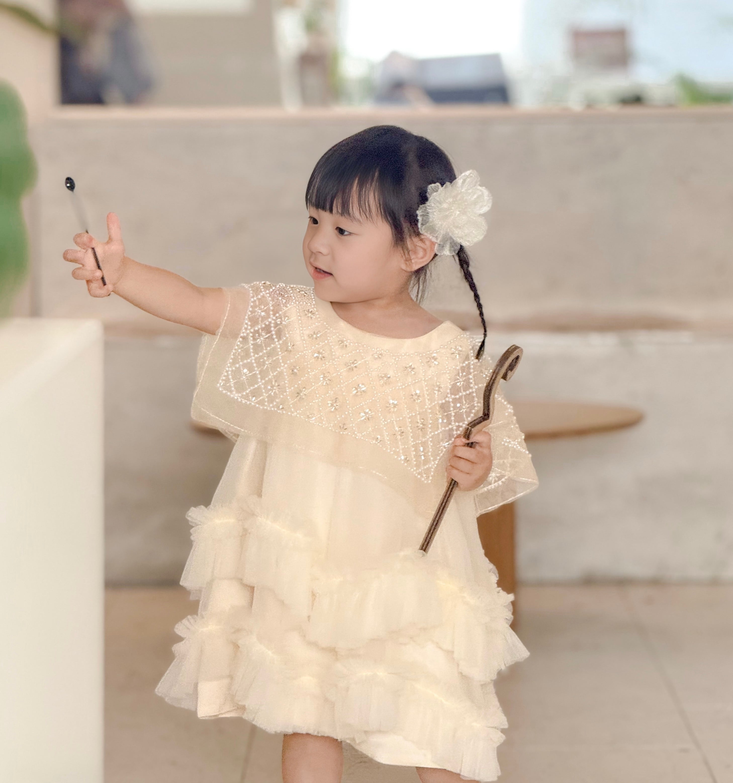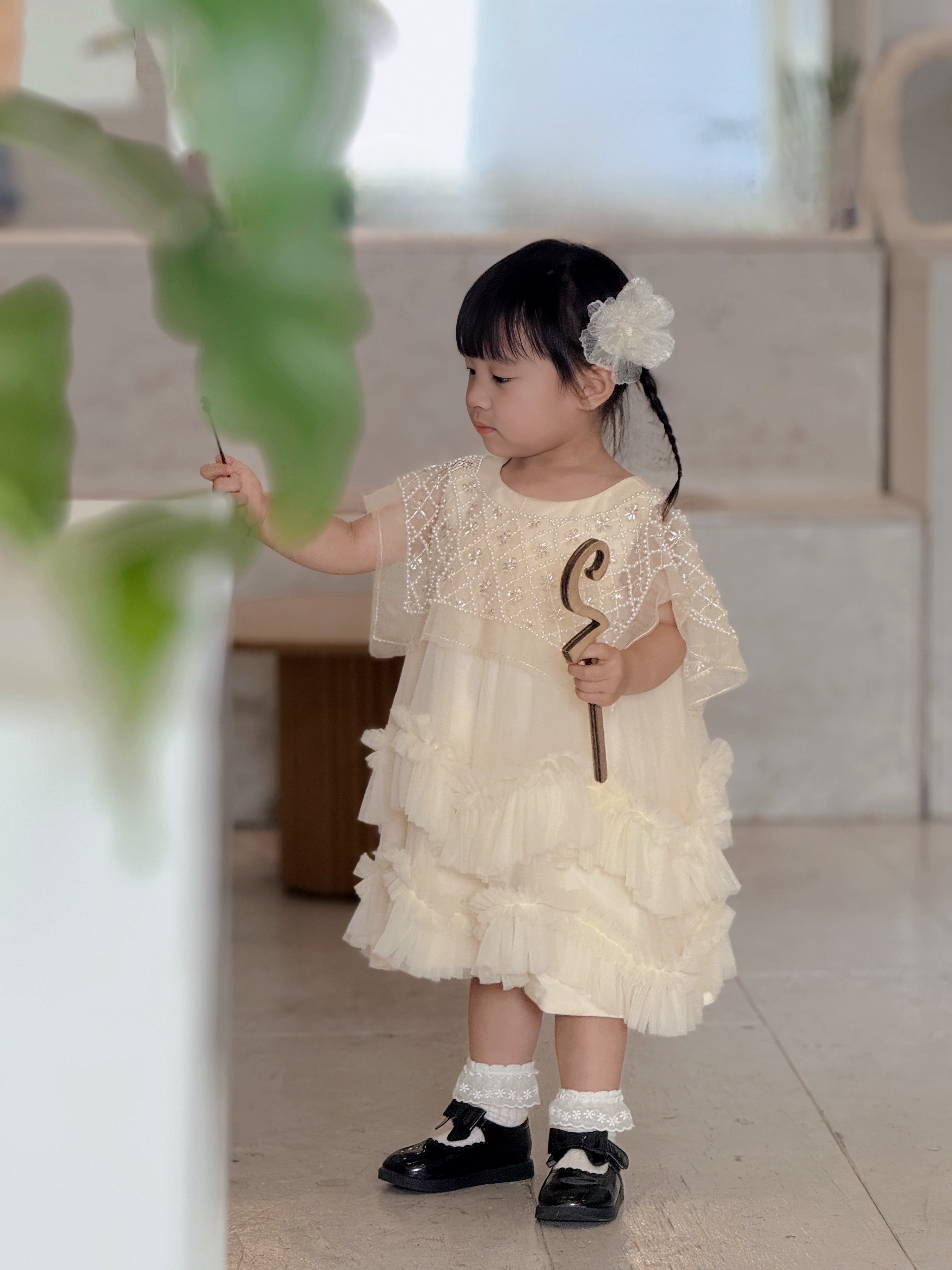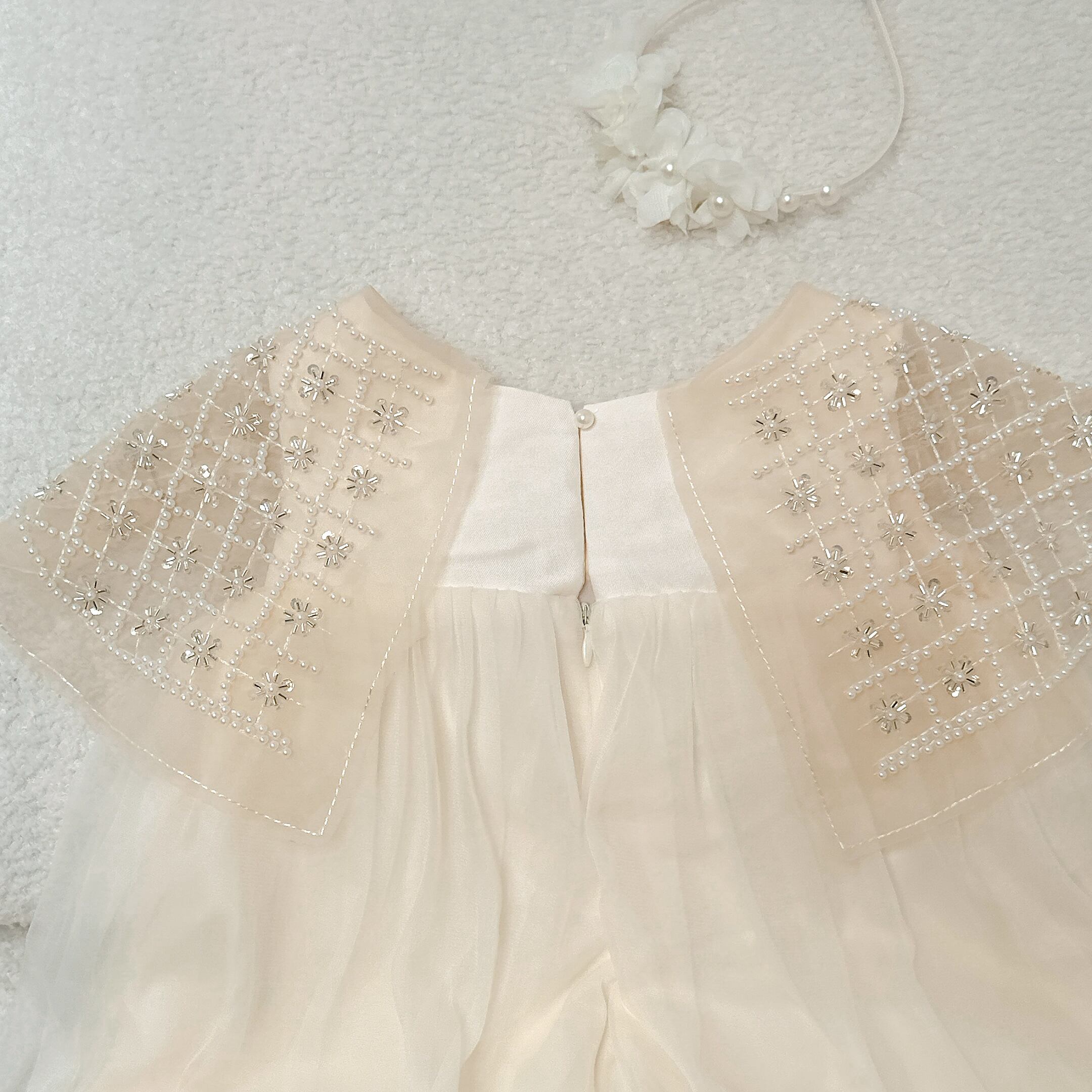 上品なパール&スパンコール付きのスクエアネックと綺麗なチュールが魅力的です。パーティーや発表会など、特別な日のおしゃれにもピッタリです。