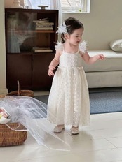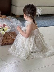 まるで夢の中にいるかのような優雅さを演出する特別な一着です。オフホワイトの色合いに、繊細なお花の刺繍が施されており、どんなシーンでも品よく華やかさを添えてくれます。