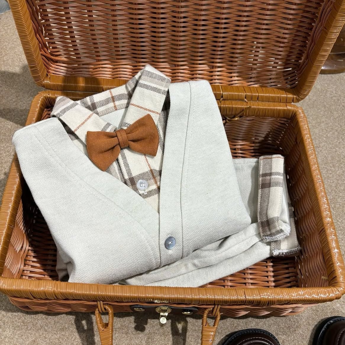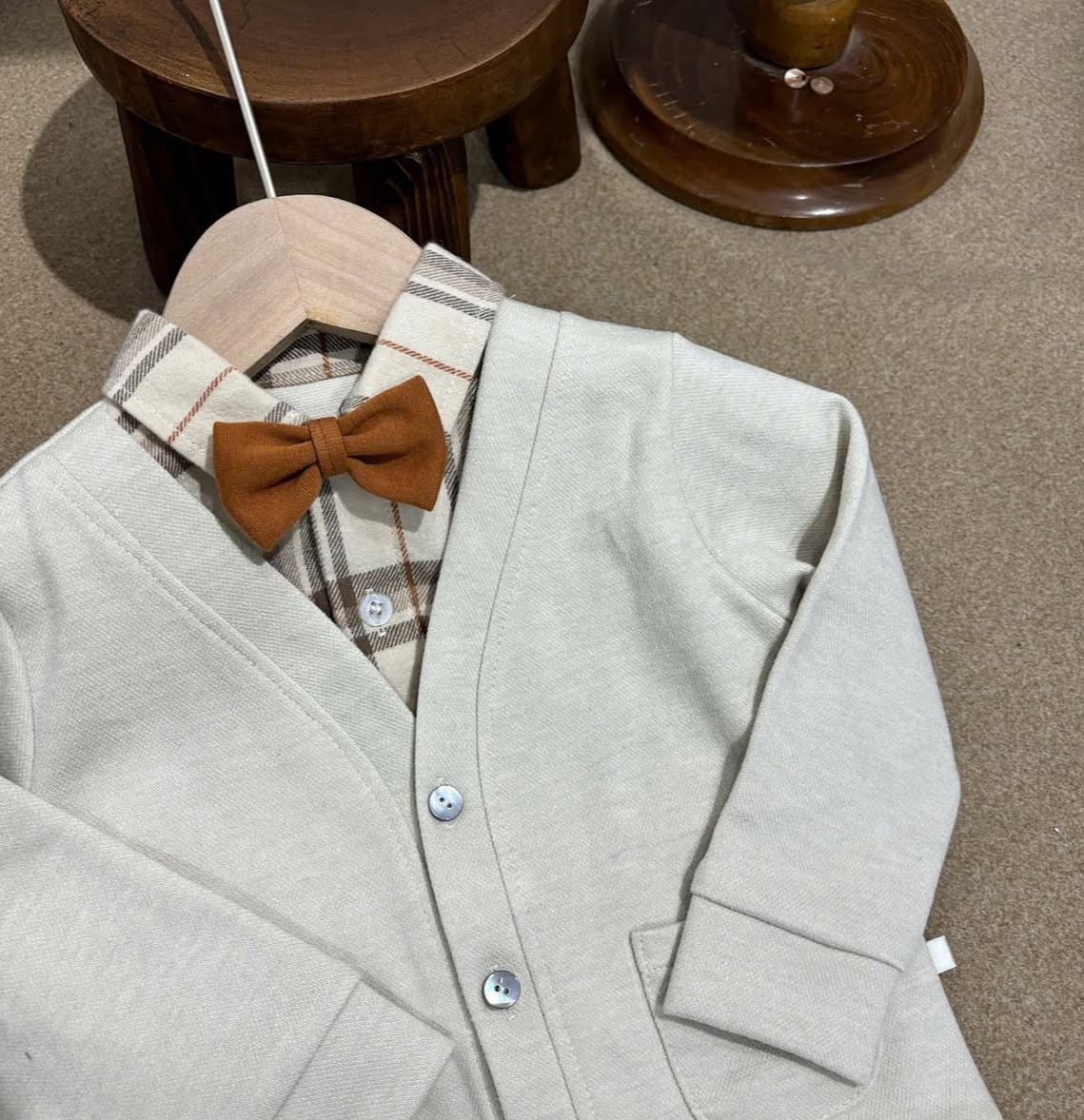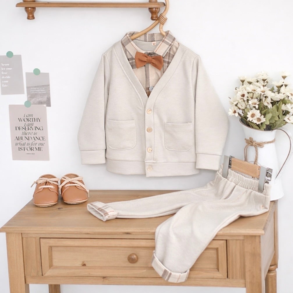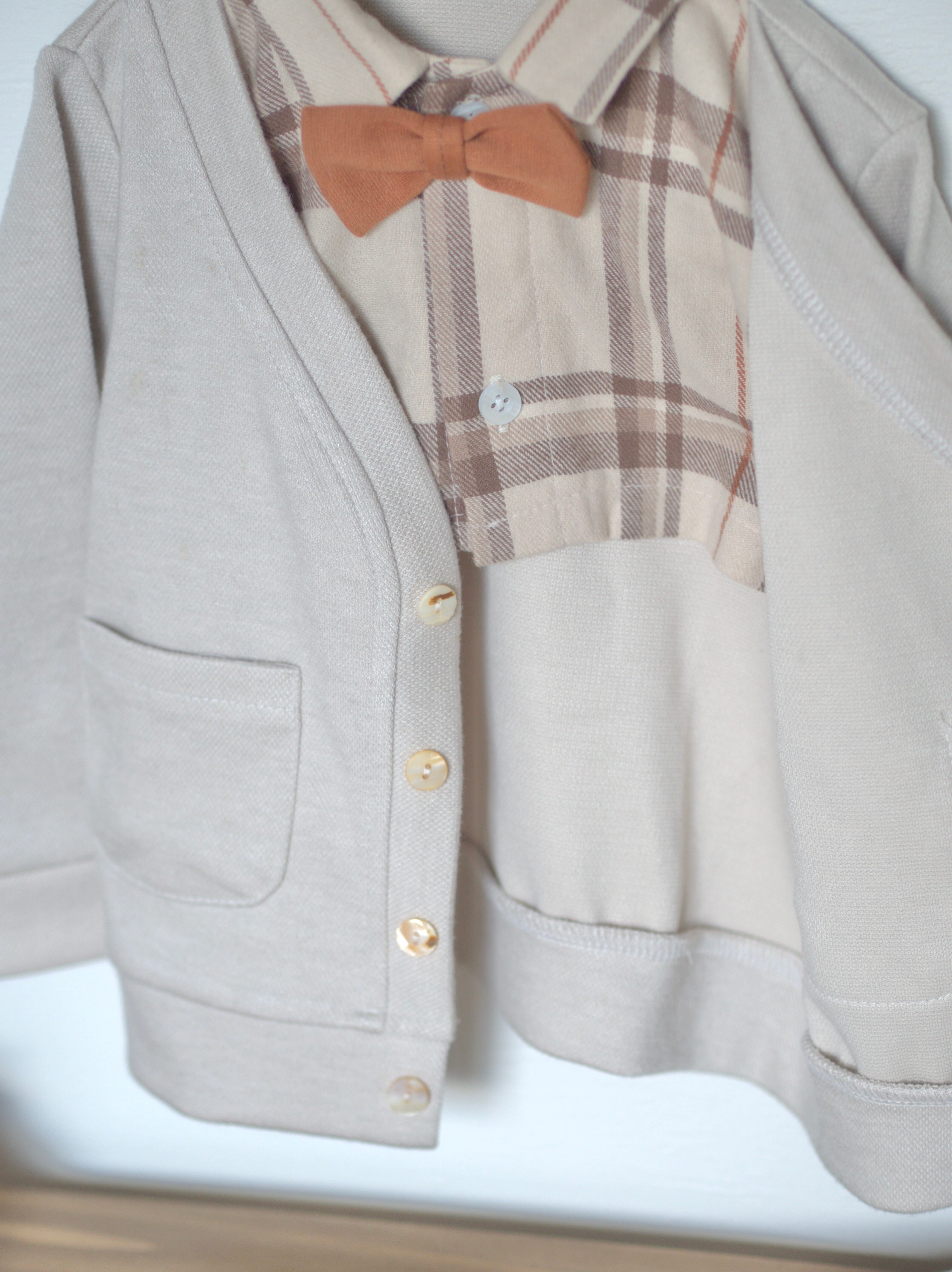 Soft Beige Check Set 英国風ベビーフォーマル 3点セット英国風 チェック柄 セットアップ 男の子 ベビーカーディガン セレモニー服 おめかし 入園式 卒園式 結婚式 お呼ばれ