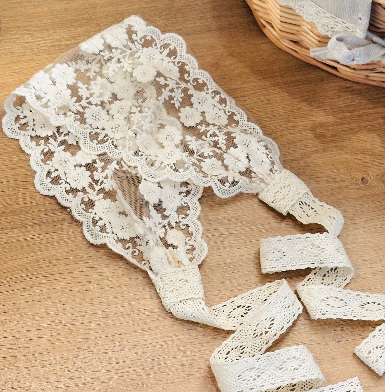 おはな柄がかわいい韓国レースと韓国リボンを使いバブーシュカ風のヘッドドレスを作りました♩