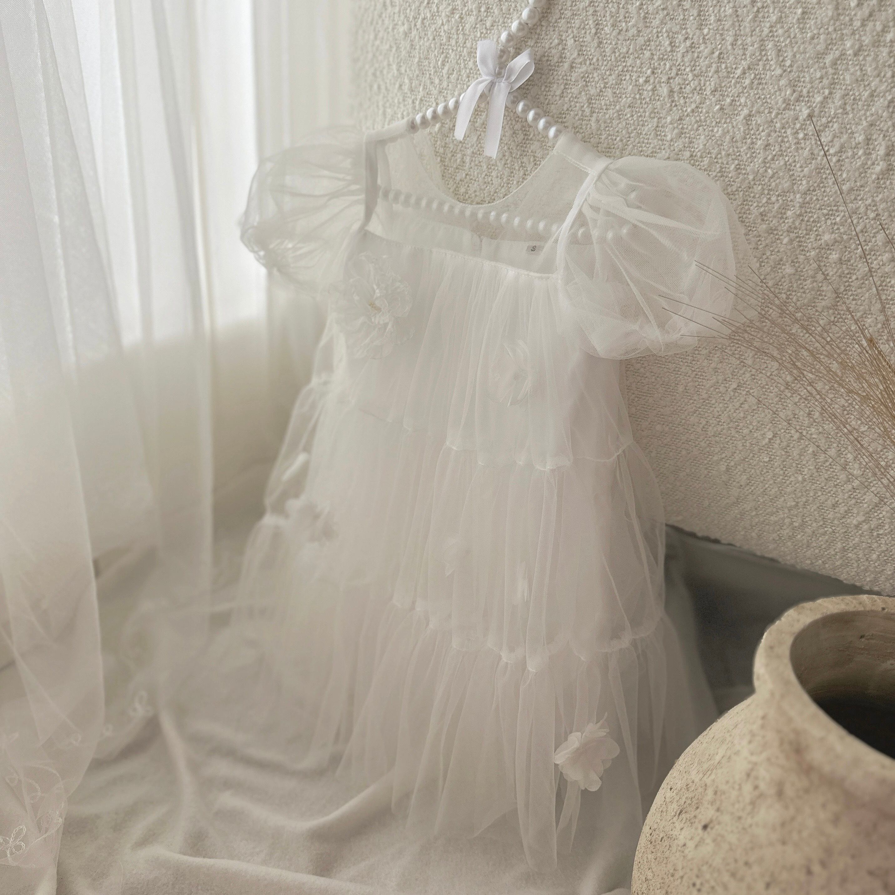 EMA DRESSは、可愛らしいお花が散りばめられて、チュール素材を使用した可憐なデザインです。赤ちゃんから幼児期の女の子まで着られるセレモニードレスとして、結婚式や発表会、誕生日など、特別な日にぴったりです。