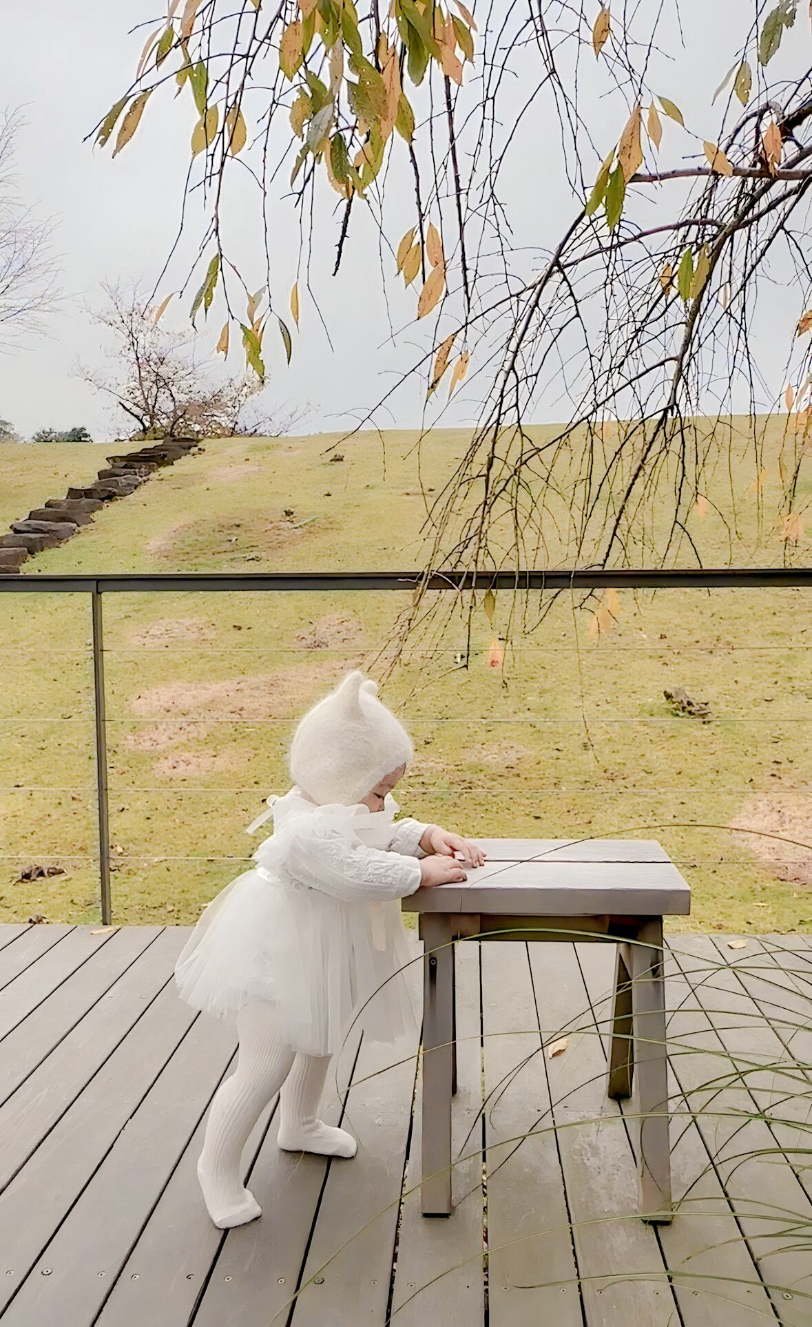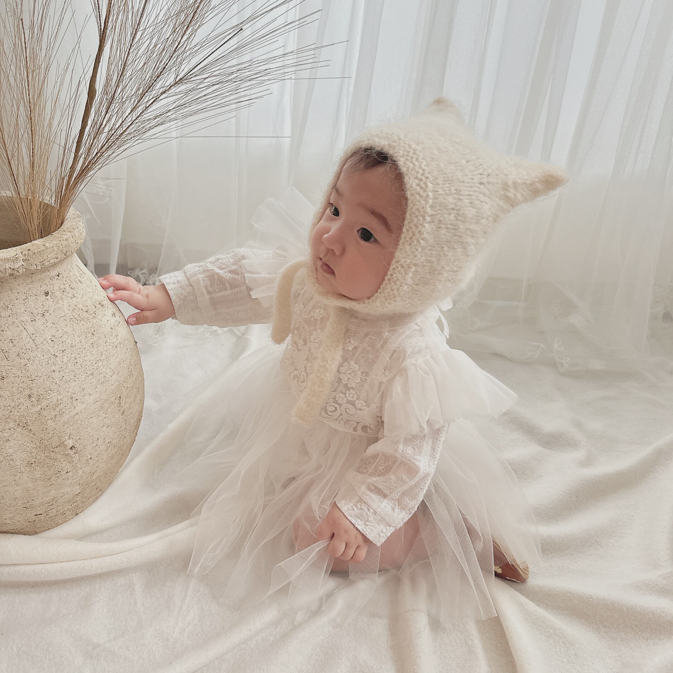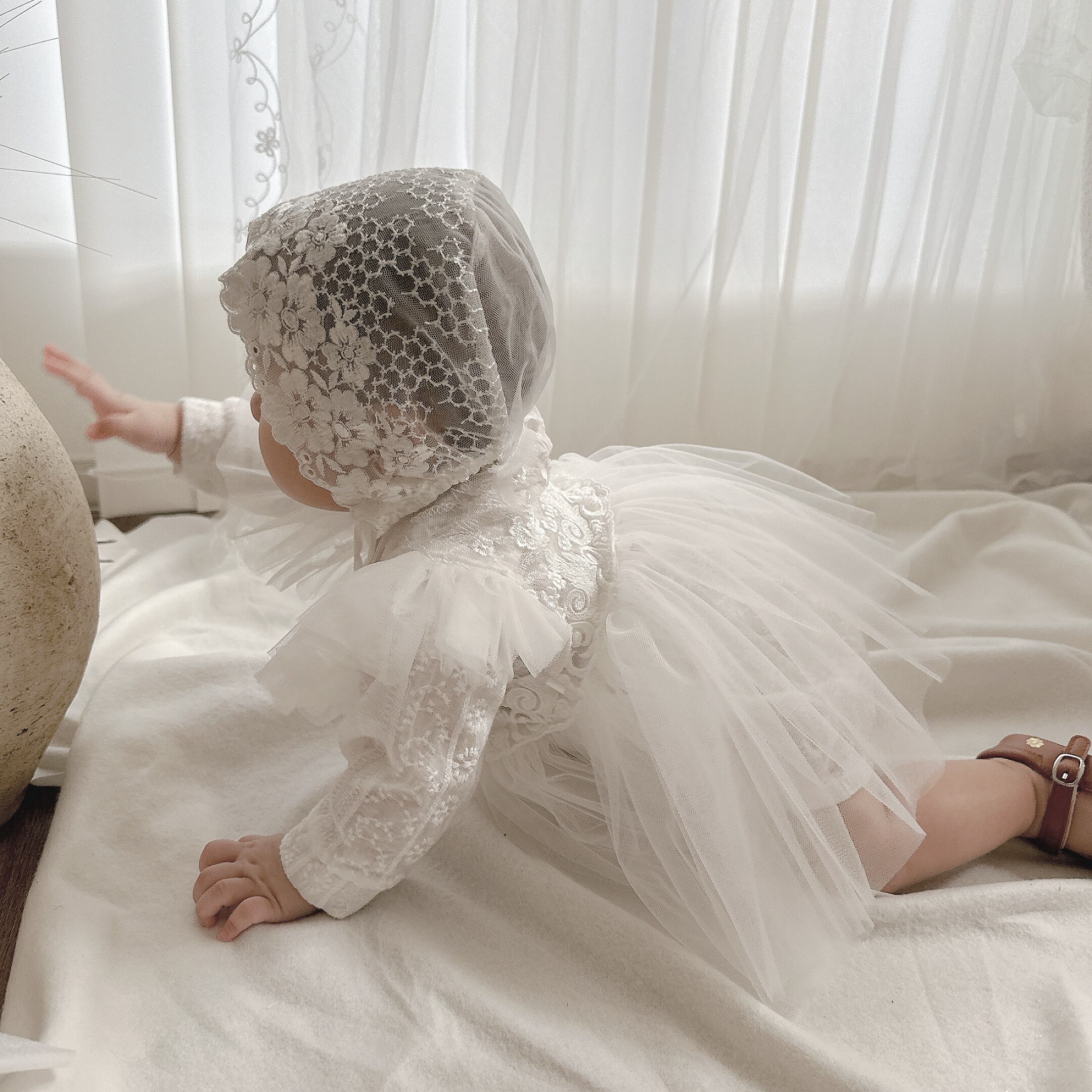 チュールワンピースとボンネットのセットで、ベビーの特別な日にぴったりの一着です。