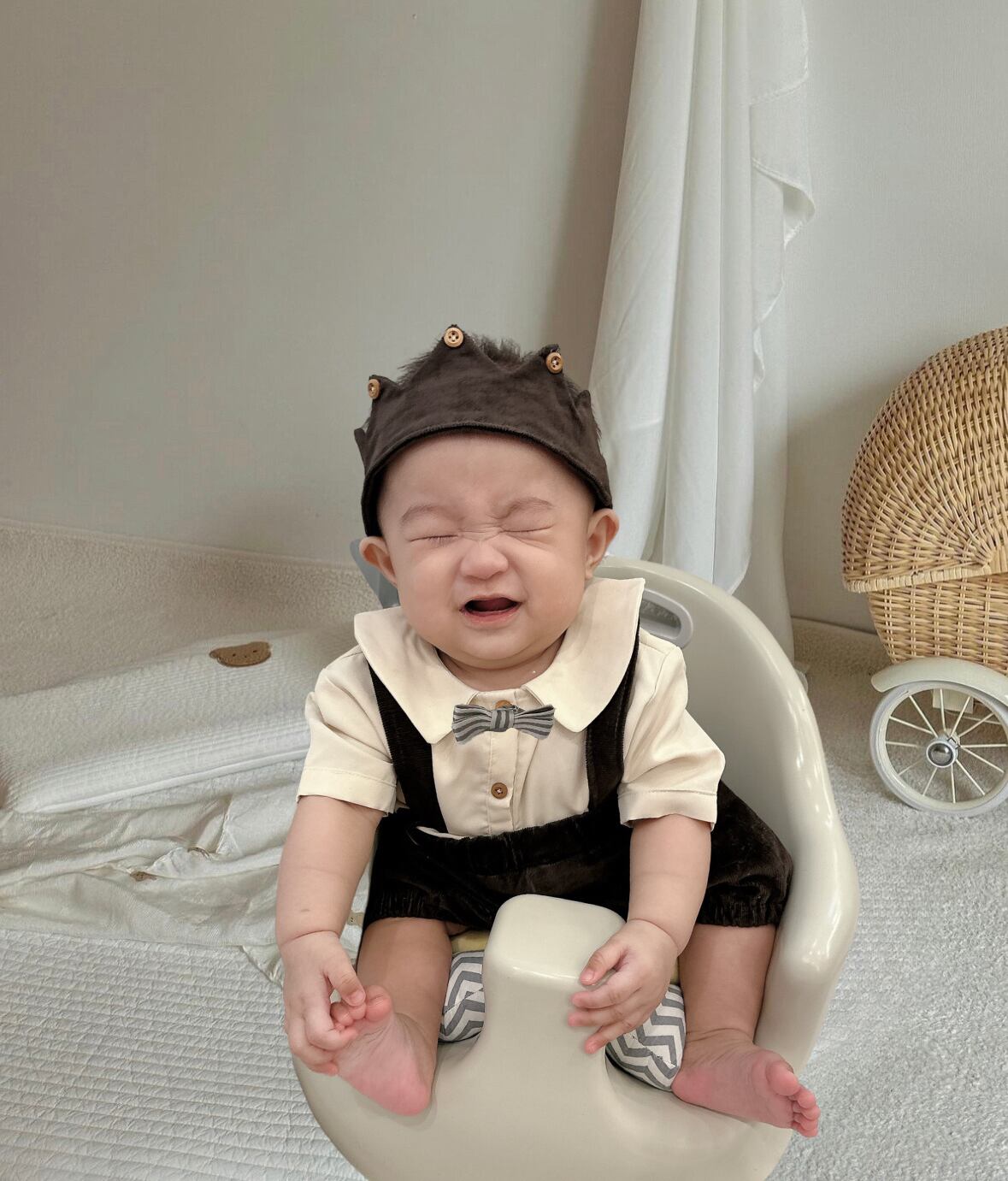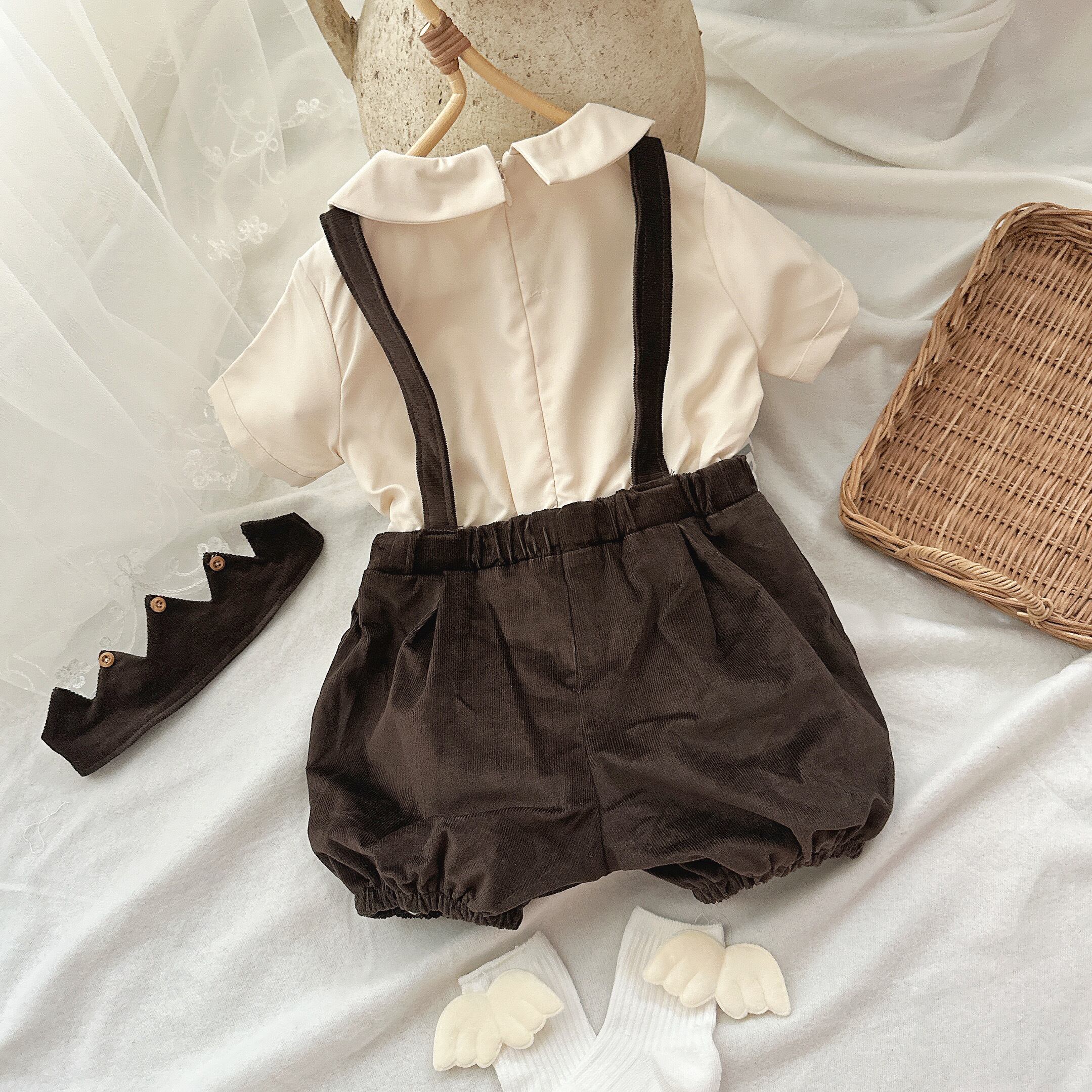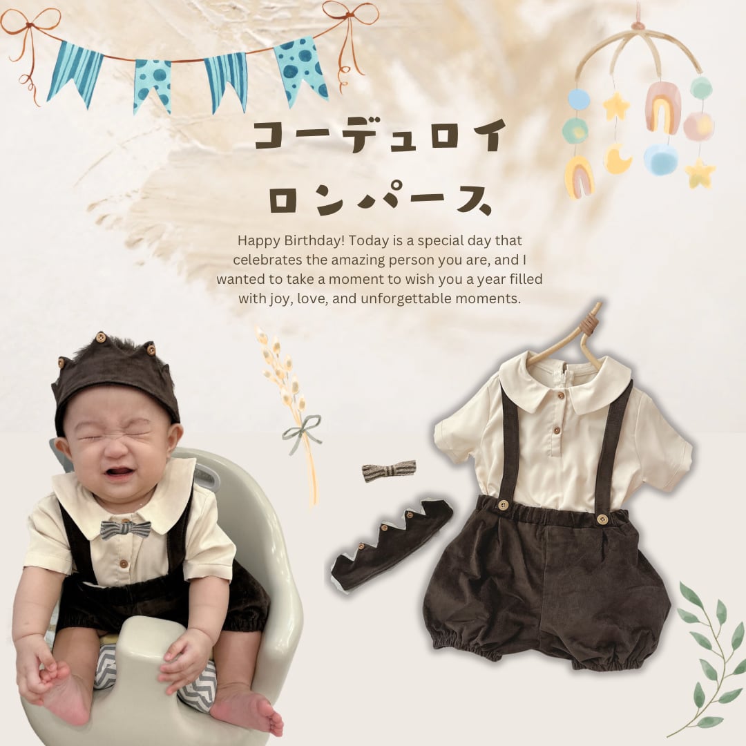 ブラウンの落ち着いた色合いが男の子らしさを引き立て、一瞬でフォーマルな雰囲気を作り上げます。 このロンパースは、七五三、お宮参り、お出かけや100日のお祝いなどの特別な日にぴったりですが、普段のおしゃれなコーディネートにも使える優れもの。サスペンダーとハーフパンツのデザインがアクセントになり、インスタ映えもばっちりです。