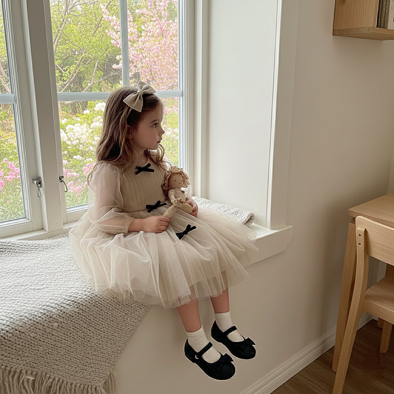 可愛らしいリボンがアクセントのRibbon tulle dressです。ふんわりとした素材感が女の子の可愛らしさを引き立てます。長袖デザインで肌触りの良い素材を使用し、快適に着用できるように作られています。