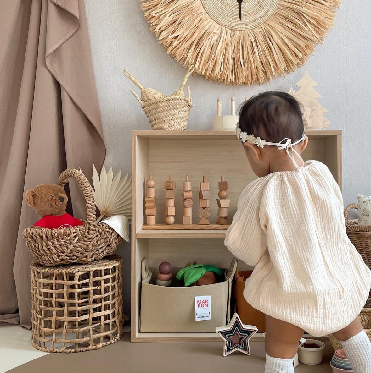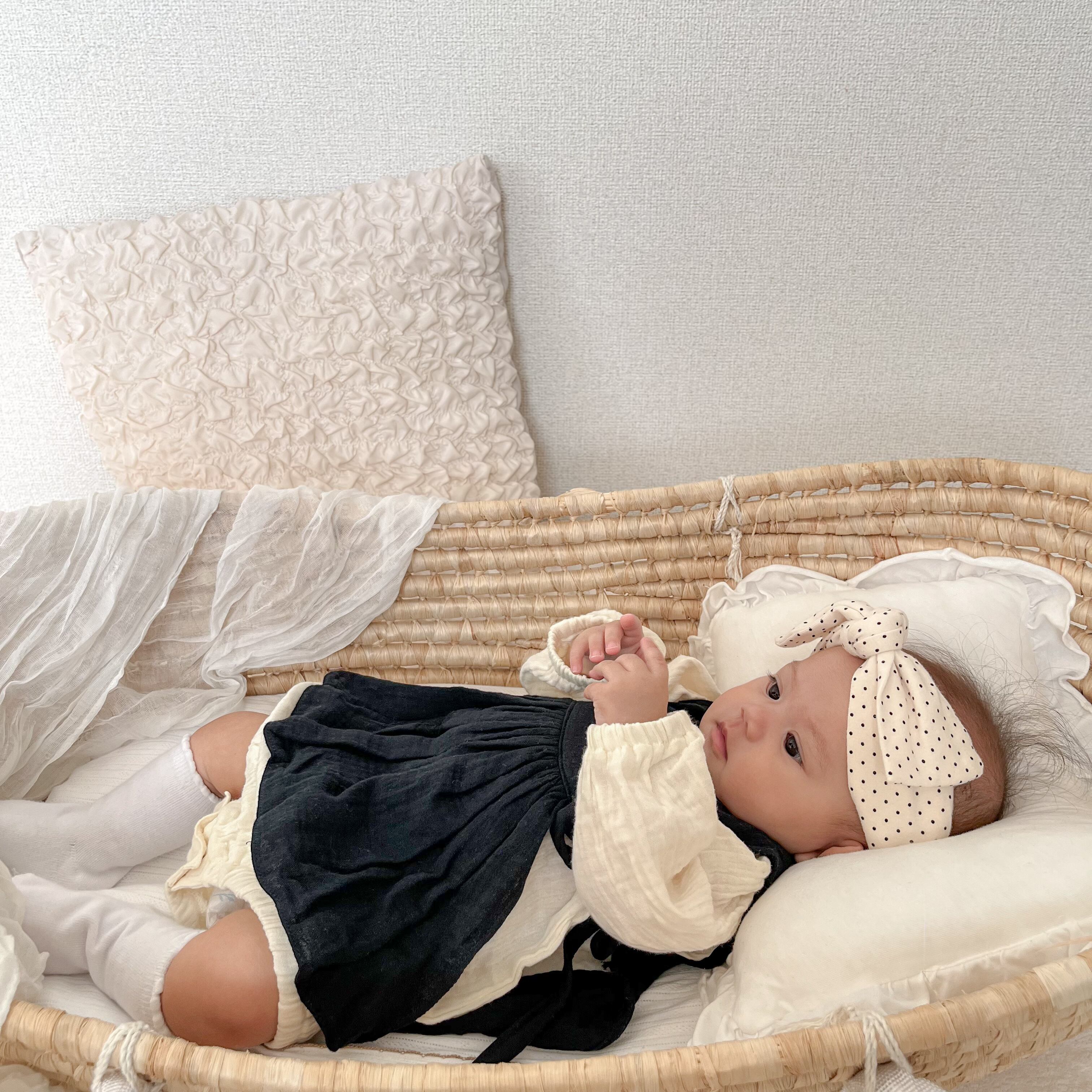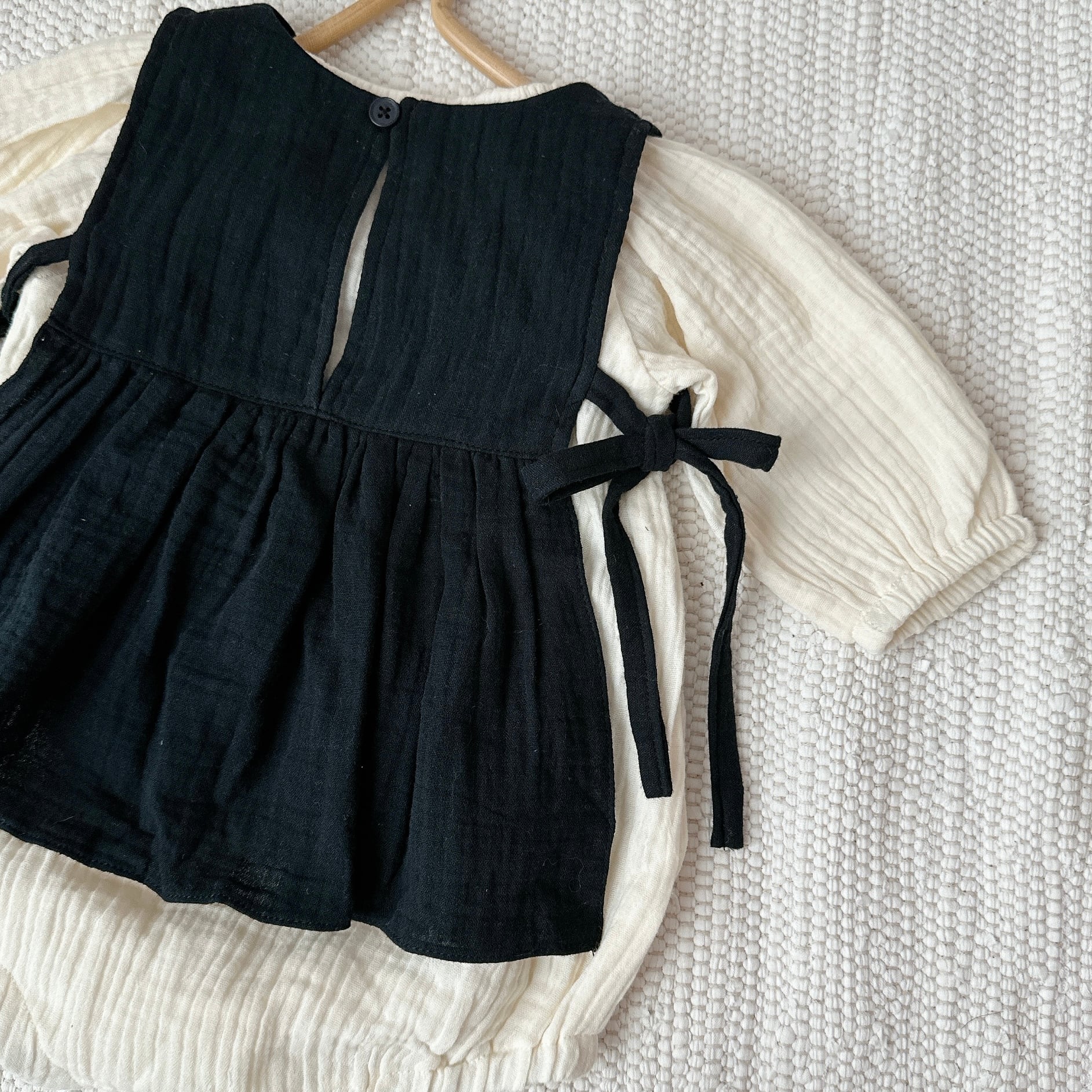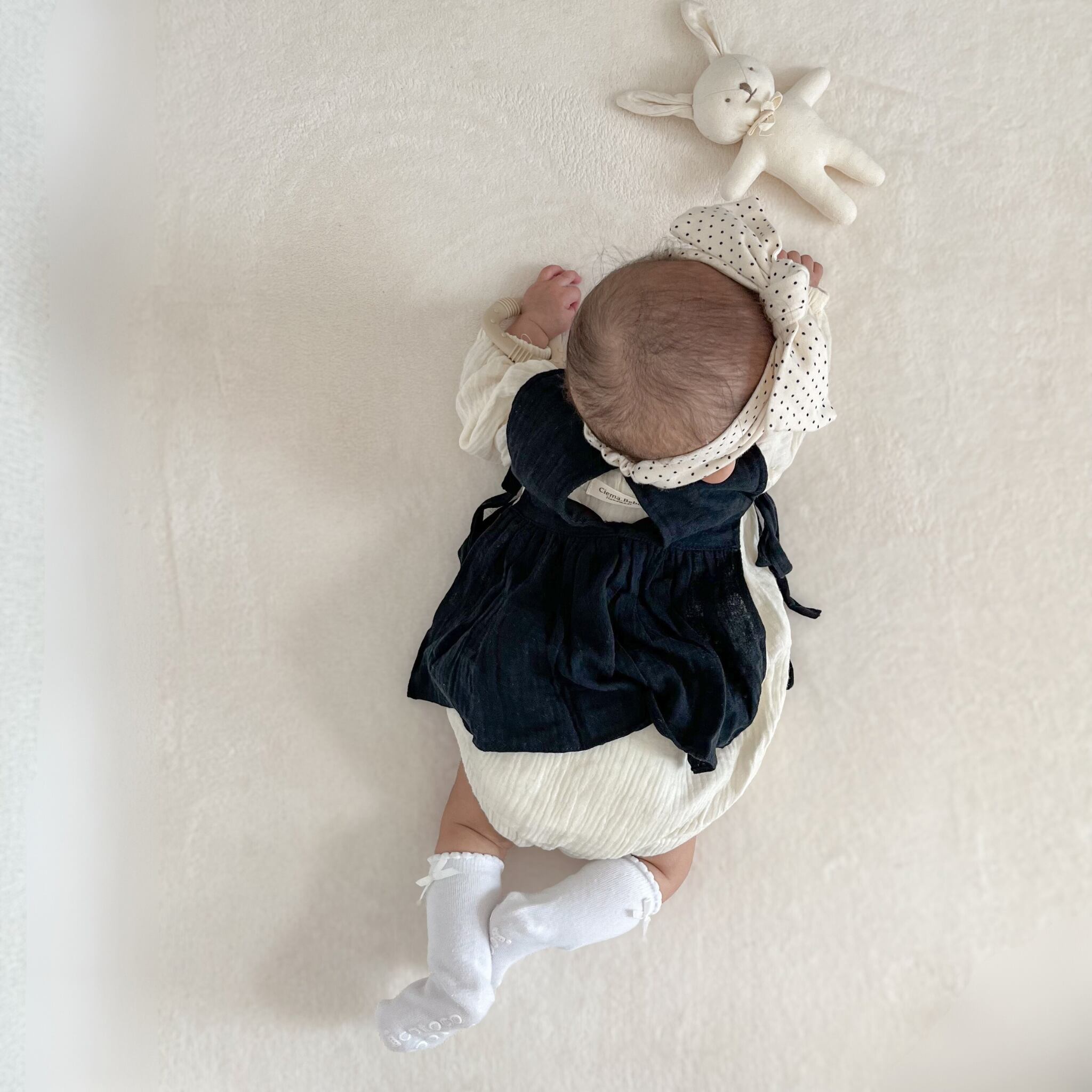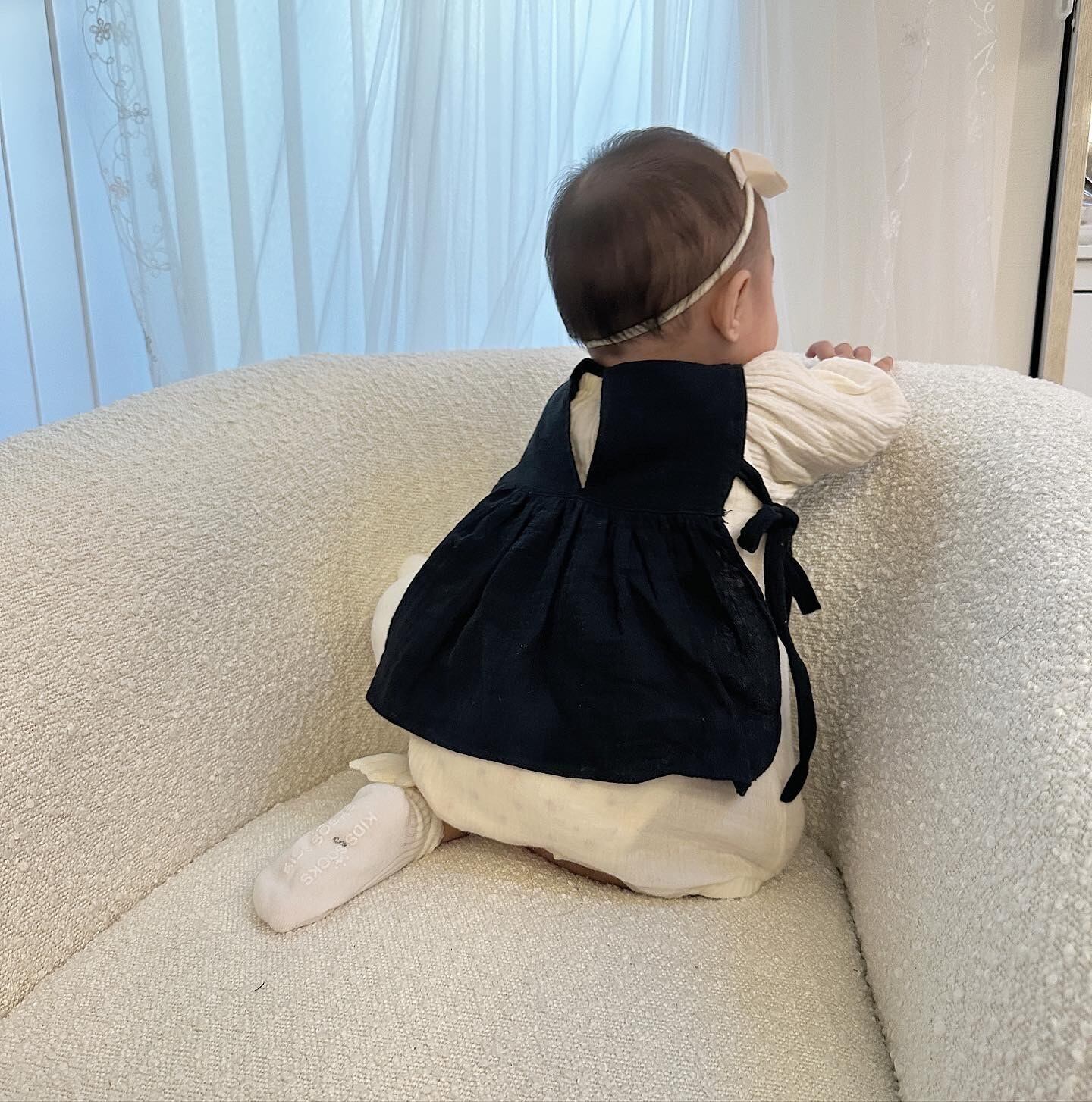 柔らかいマスリン生地で作られた長袖ロンパースとブラックベストの2点セットは、韓国子供服の風を感じるアイテムです。