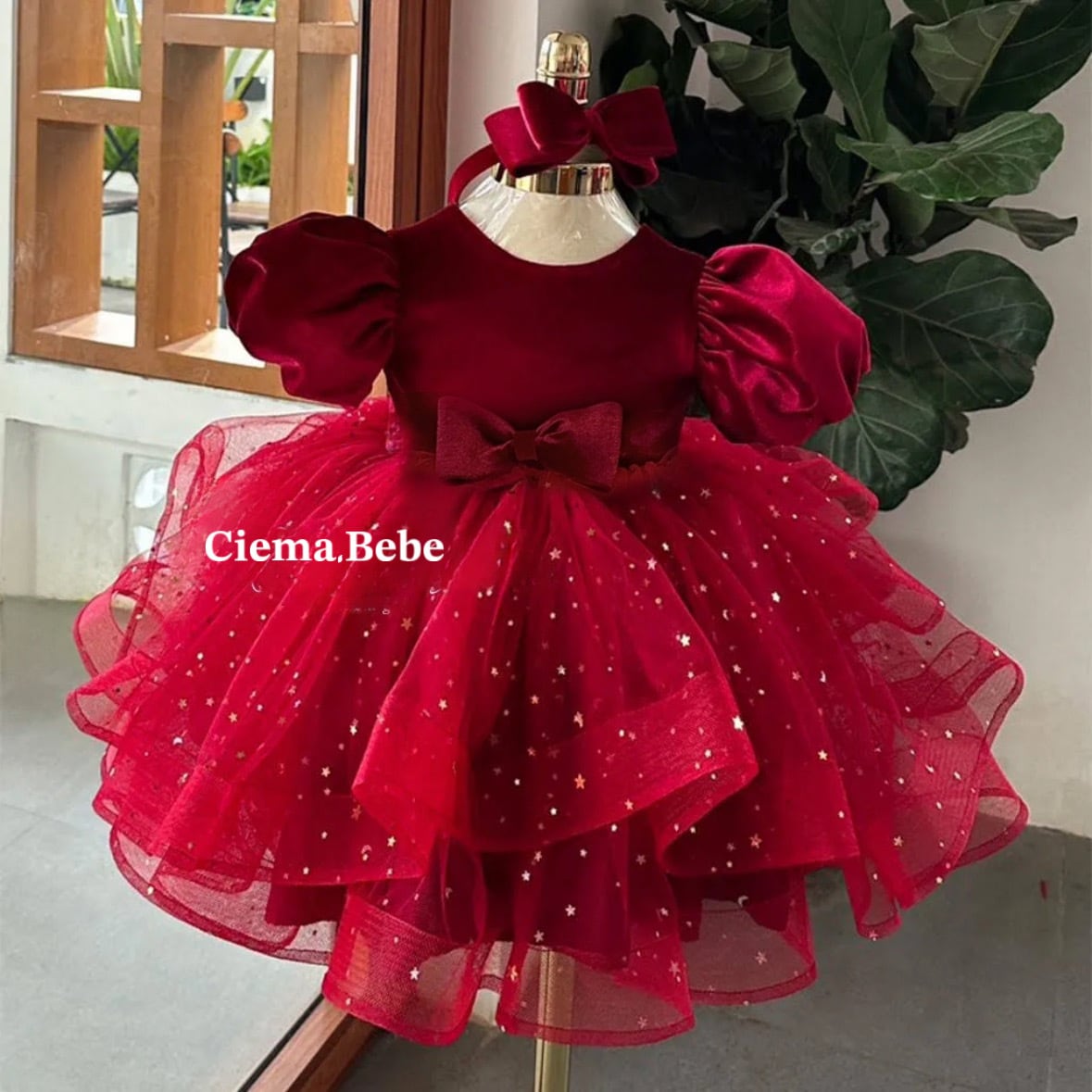 【即納】ベルベット チュールドレス リボンカチューシャ付き ベビードレス 誕生日ドレス クリスマス服 セレモニードレス キッズ 可愛い服 80 100 120 130