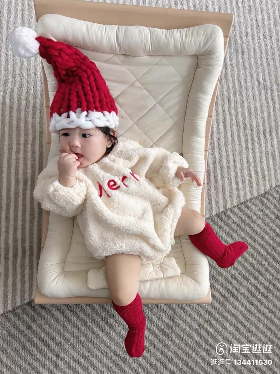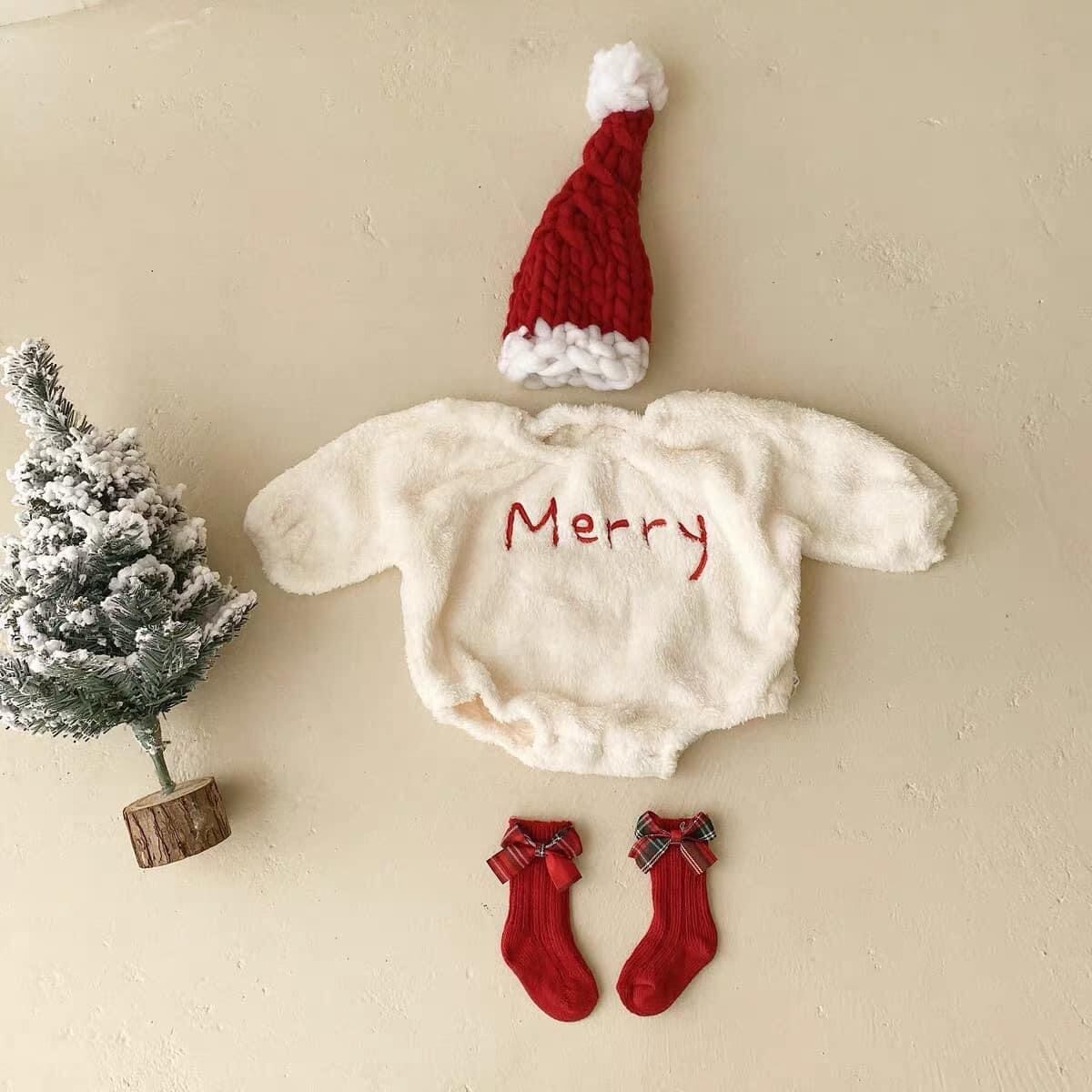 3点セット merryふわふわロンパース+鹿角の帽子+ニットサンタ帽子セット+リボン付き靴下 クリスマス コスプレ
