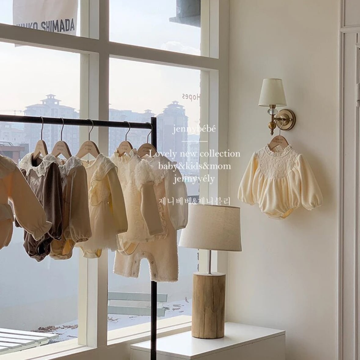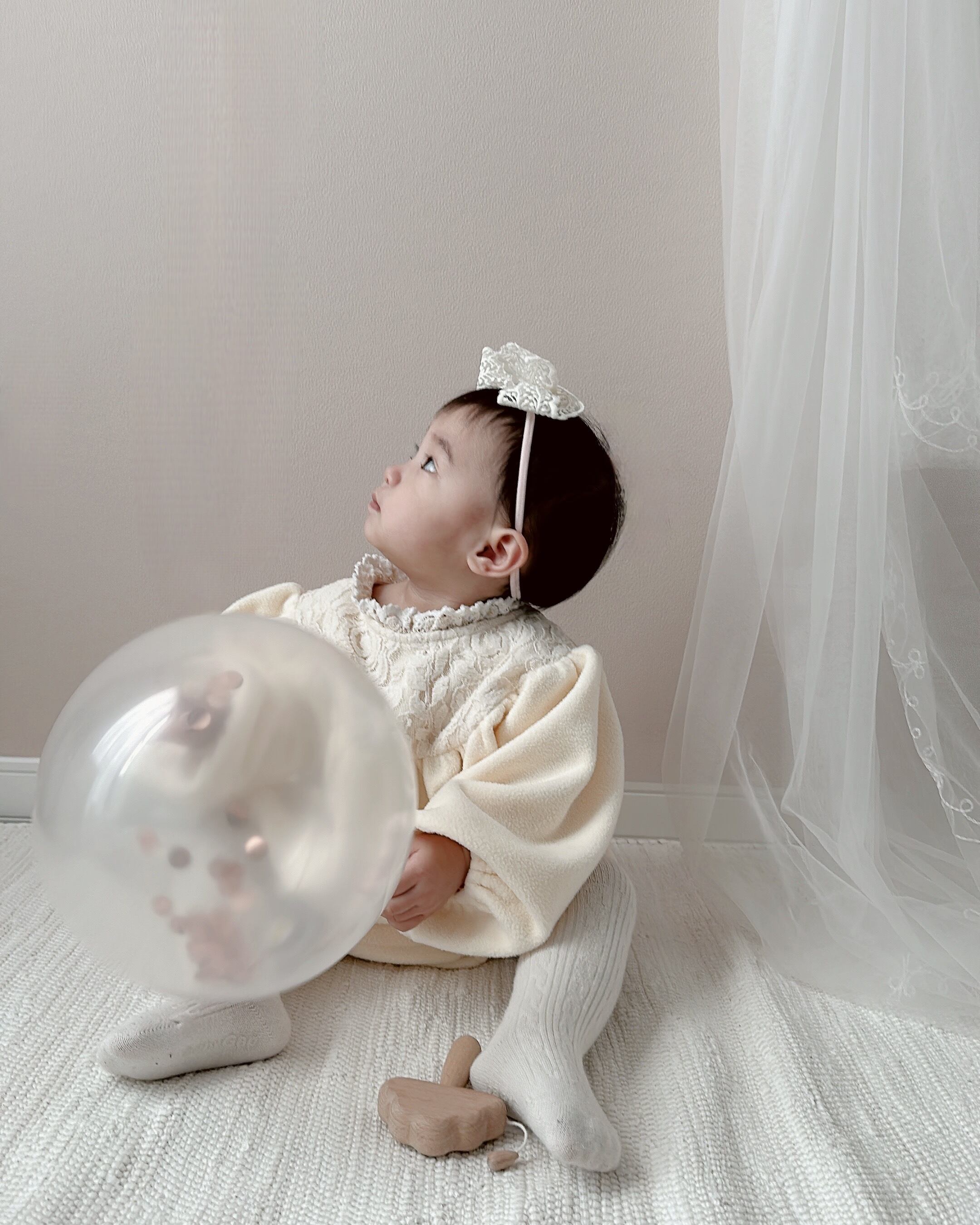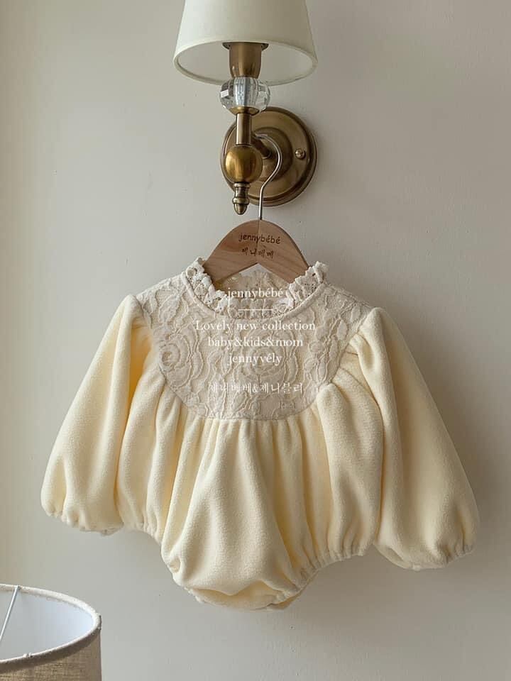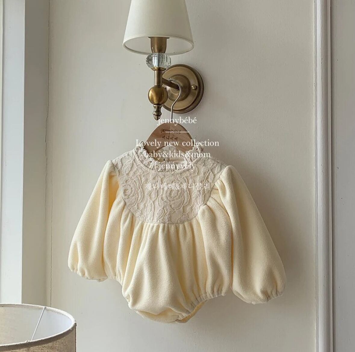 可愛らしい花のレースがデザインされた、赤ちゃんの女の子向けロンパース。柔らかく暖かいフリース素材でできたロンパースは、キャンディーカラーでプリンセスのような雰囲気を演出します。