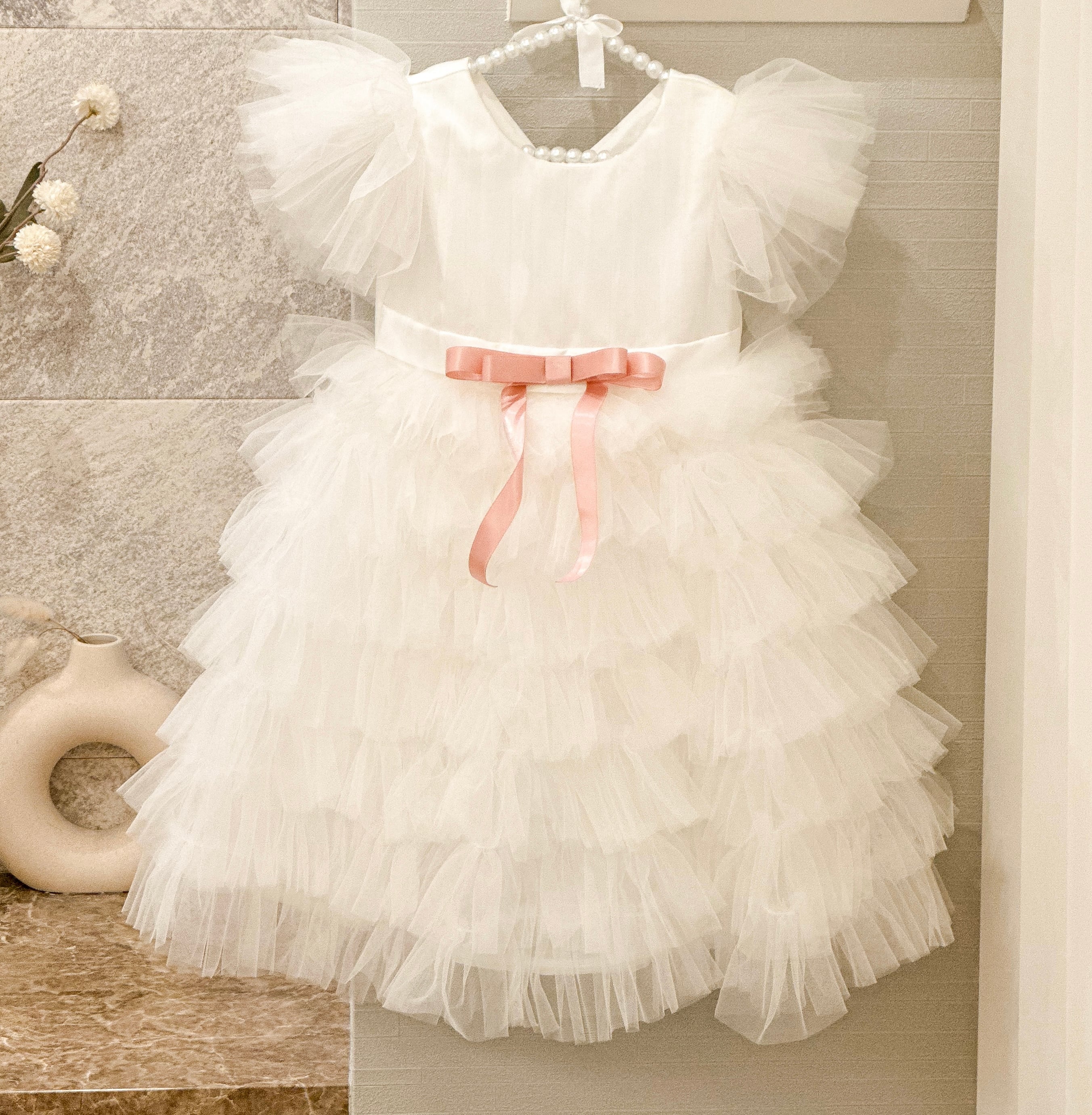 Ribbon white dressは、可愛らしいリボンがアクセントのチュールドレスです。結婚式や演奏会などの特別な日にぴったりのセレモニー服としておすすめです。ふんわりとしたチュールが女の子らしい優雅さを演出し、真っ白なドレスは清楚な印象を与えます。