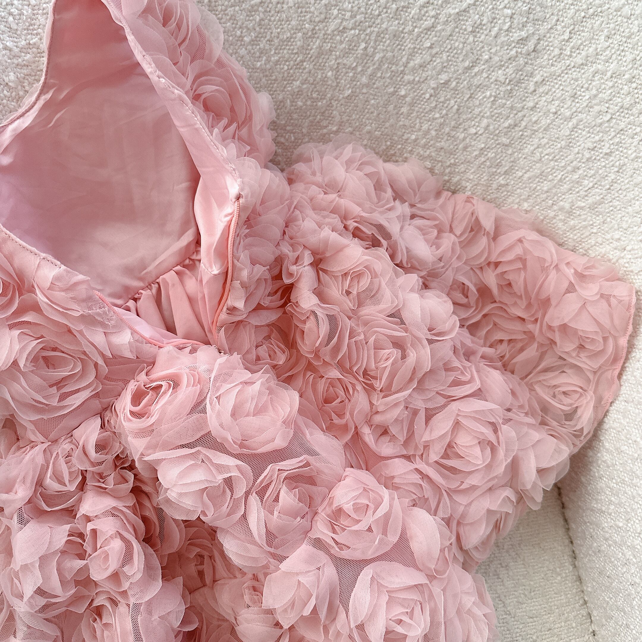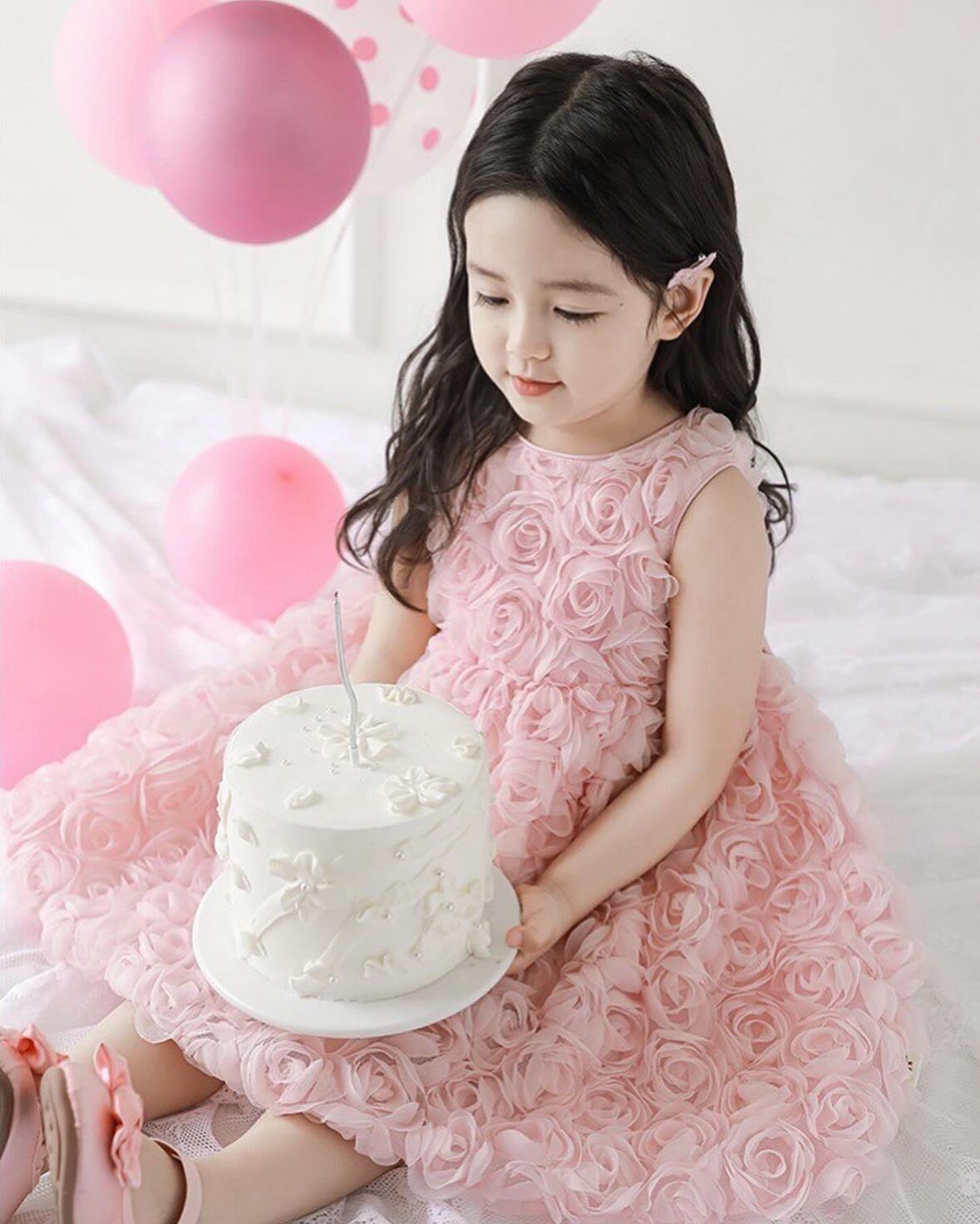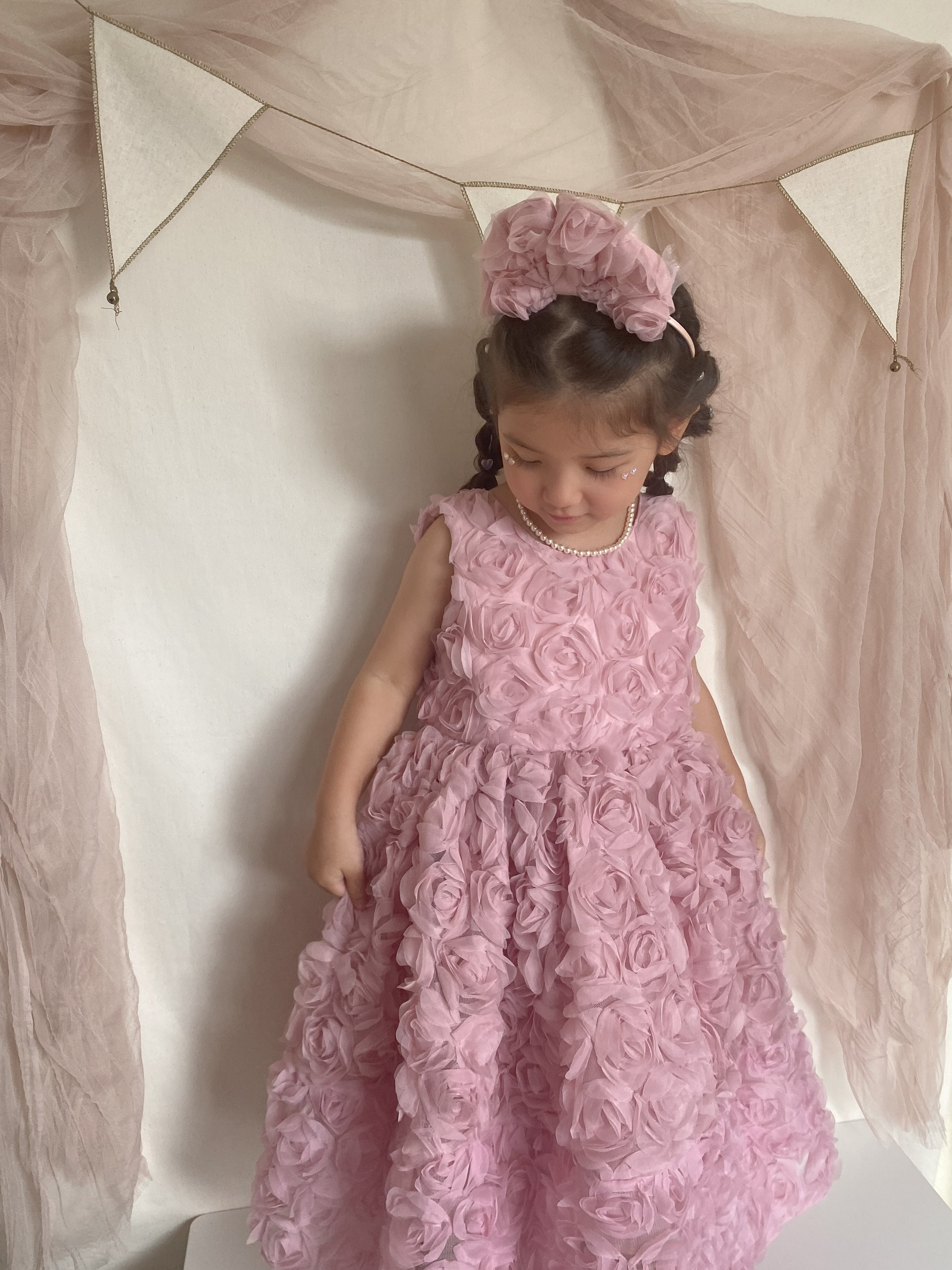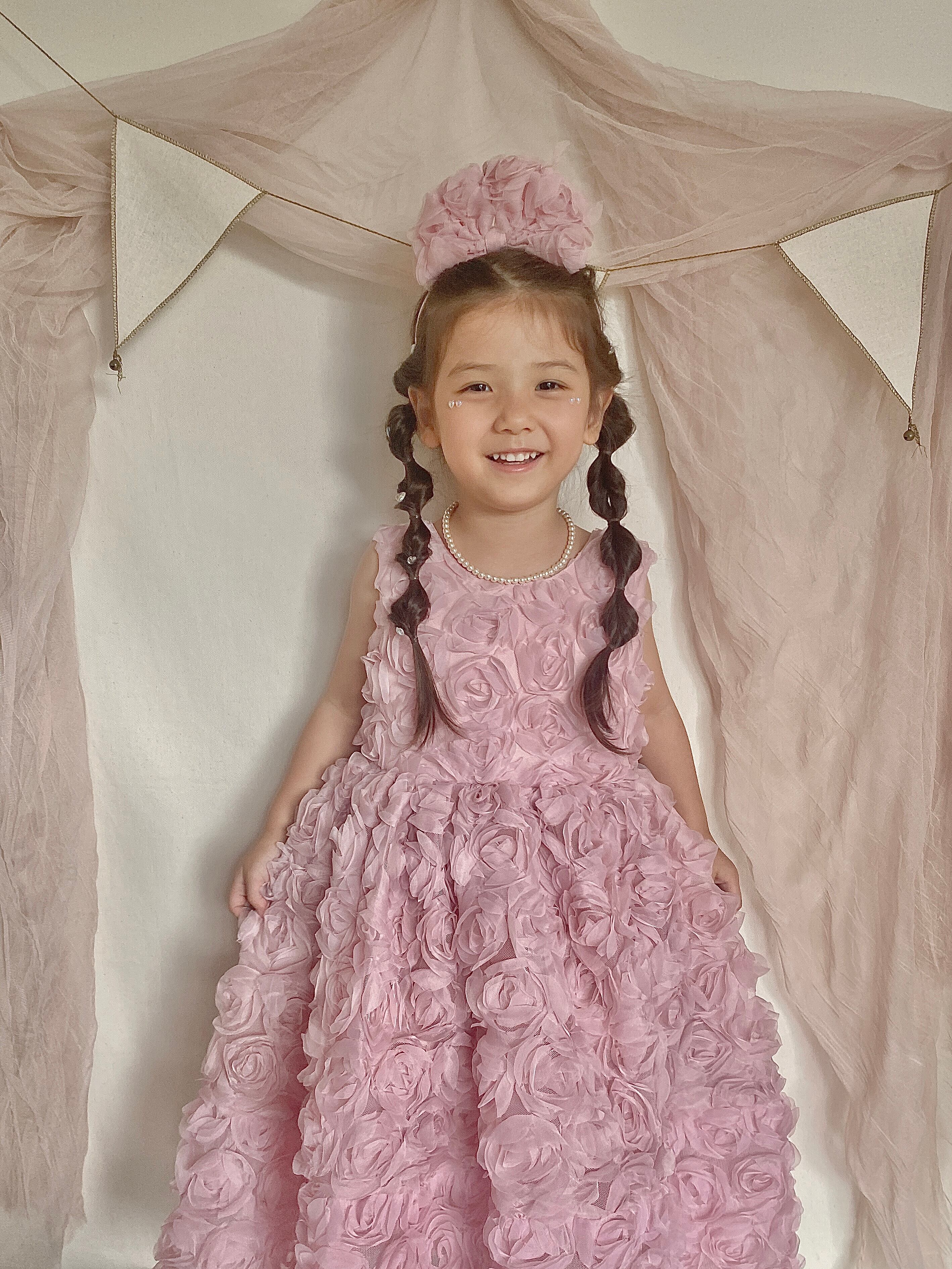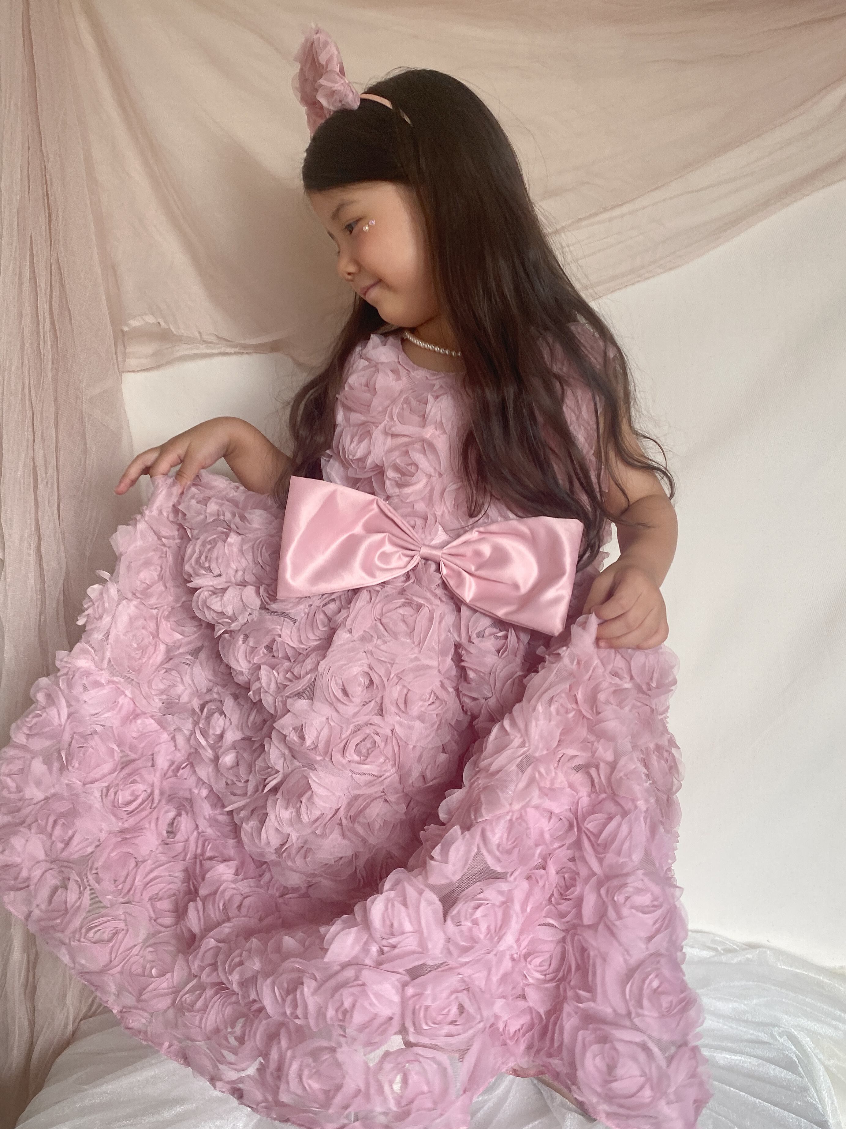 このローズモチーフドレスは、立体的なフワラーモチーフの生地が華やかさを演出します。フォーマルなシーンにぴったりなデザインは、誕生日やセレモニー、演奏会やピアノの発表会など、特別な日におすすめです。女の子たちが憧れるような可愛さとエレガンスを兼ね備えた一着です。