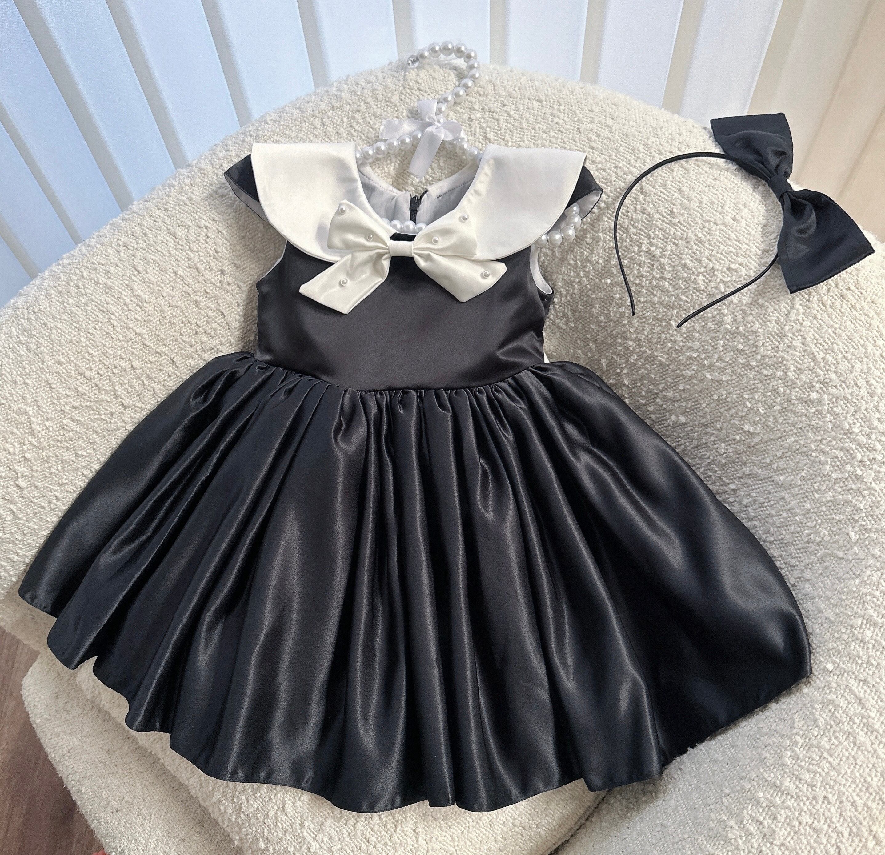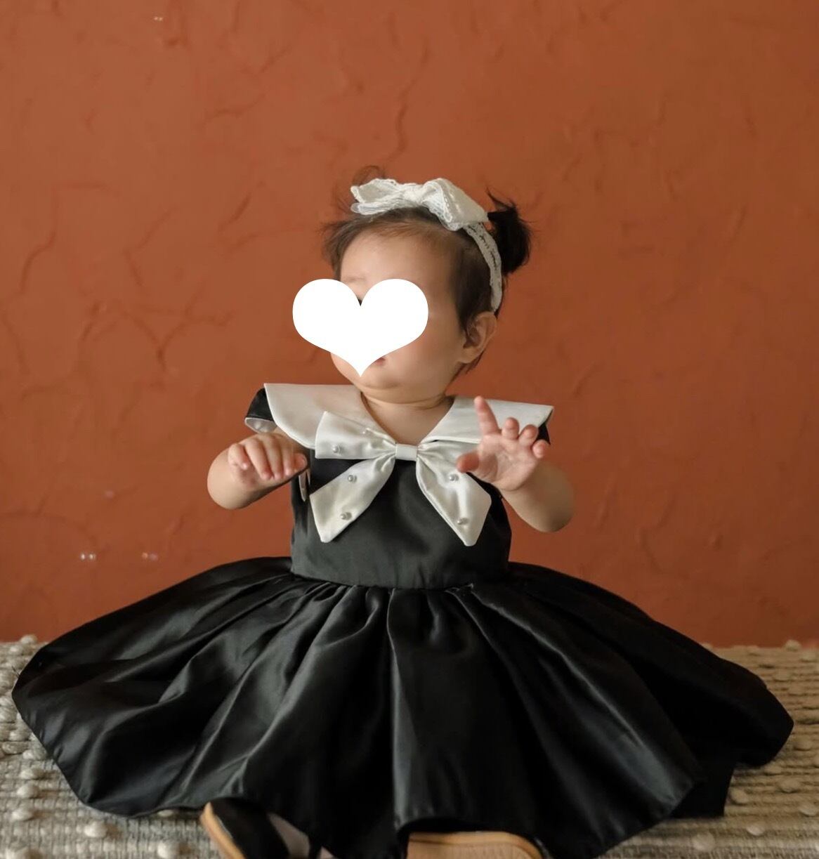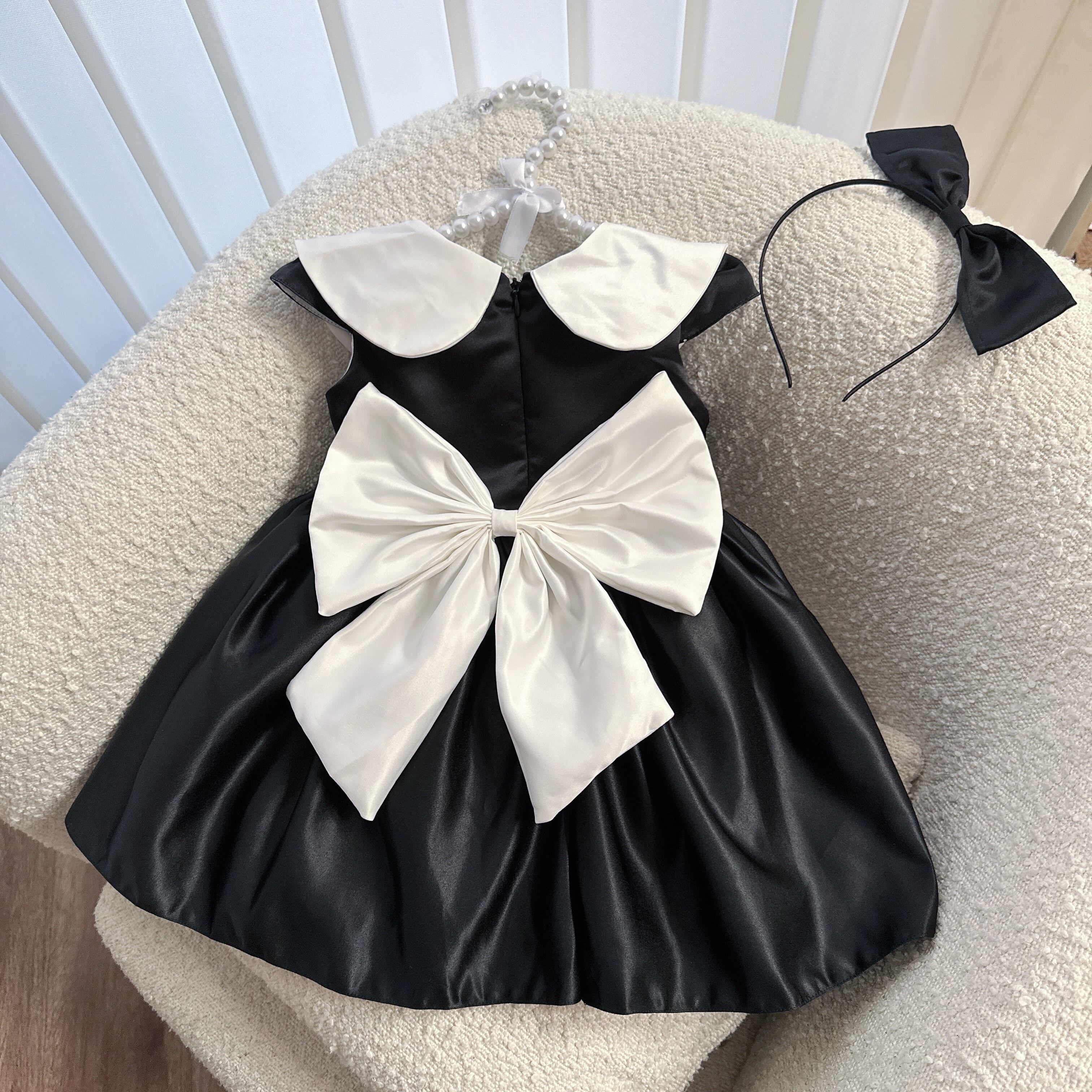 優雅なブラックカラーとホワイトリボンが印象的な、キッズ向けフォーマルドレスです。